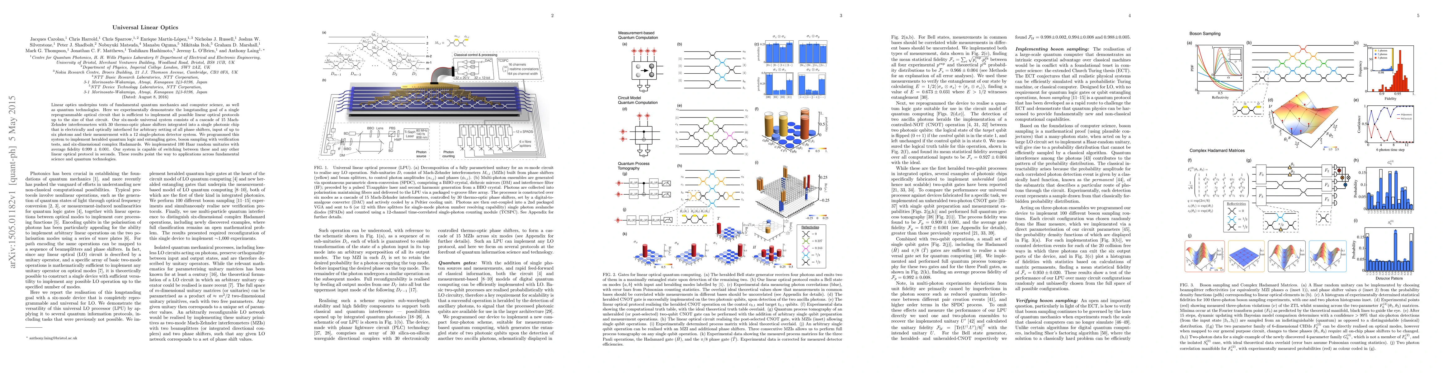Linear optics underpins tests of fundamental quantum mechanics and computer science, as well as quantum technologies. Here we experimentally demonstrate the longstanding goal of a single reprogrammable optical circuit that is sufficient to implement all possible linear optical protocols up to the size of that circuit. Our six-mode universal system consists of a cascade of 15 Mach-Zehnder interferometers with 30 thermo-optic phase shifters integrated into a single photonic chip that is electrically and optically interfaced for arbitrary setting of all phase shifters, input of up to six photons and their measurement with a 12 single-photon detector system. We programmed this system to implement heralded quantum logic and entangling gates, boson sampling with verification tests, and six-dimensional complex Hadamards. We implemented 100 Haar random unitaries with average fidelity 0.999 $\pm$ 0.001. Our system is capable of switching between these and any other linear optical protocol in seconds. These results point the way to applications across fundamental science and quantum technologies.