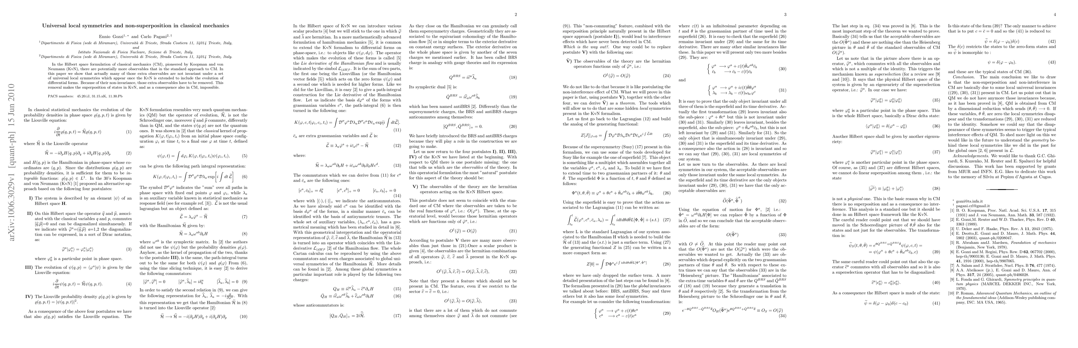 This paper explores the Hilbert space formulation of classical mechanics, revealing that many extra observables identified by the Koopman and von Neumann approach are not invariant under universal local symmetries. Consequently, these non-invariant observables must be discarded, leading to the impossibility of superposition in classical mechanics.