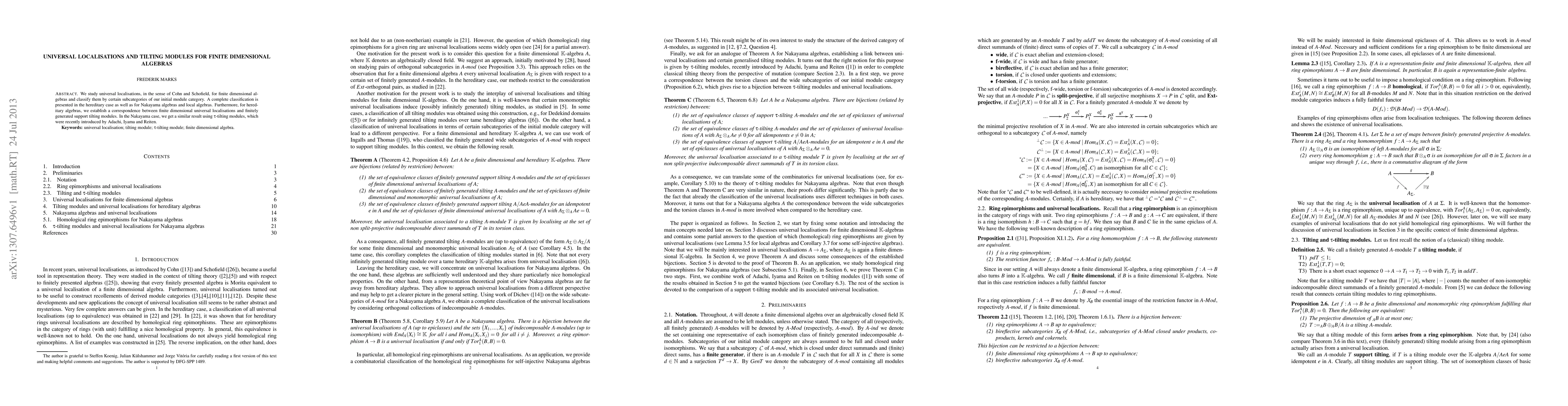 We study universal localisations, in the sense of Cohn and Schofield, for finite dimensional algebras and classify them by certain subcategories of our initial module category. A complete classification is presented in the hereditary case as well as for Nakayama algebras and local algebras. Furthermore, for hereditary algebras, we establish a correspondence between finite dimensional universal localisations and finitely generated support tilting modules. In the Nakayama case, we get a similar result using $\tau$-tilting modules, which were recently introduced by Adachi, Iyama and Reiten.