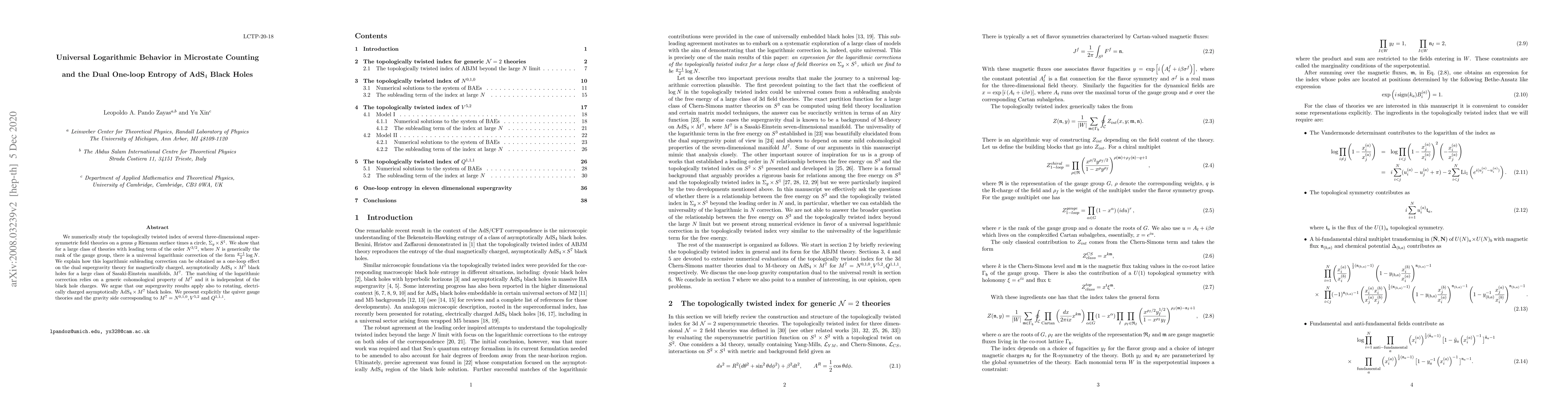 We numerically study the topologically twisted index of several three-dimensional supersymmetric field theories on a genus $g$ Riemann surface times a circle, $\Sigma_g\times S^1$. We show that for a large class of theories with leading term of the order $N^{3/2}$, where $N$ is generically the rank of the gauge group, there is a universal logarithmic correction of the form $\frac{g-1}{2} \log N$. We explain how this logarithmic subleading correction can be obtained as a one-loop effect on the dual supergravity theory for magnetically charged, asymptotically AdS$_4\times M^7$ black holes for a large class of Sasaki-Einstein manifolds, $M^7$. The matching of the logarithmic correction relies on a generic cohomological property of $M^7$ and it is independent of the black hole charges. We argue that our supergravity results apply also to rotating, electrically charged asymptotically AdS$_4\times M^7$ black holes. We present explicitly the quiver gauge theories and the gravity side corresponding to $M^7=N^{0,1,0}, V^{5,2}$ and $Q^{1,1,1}$.