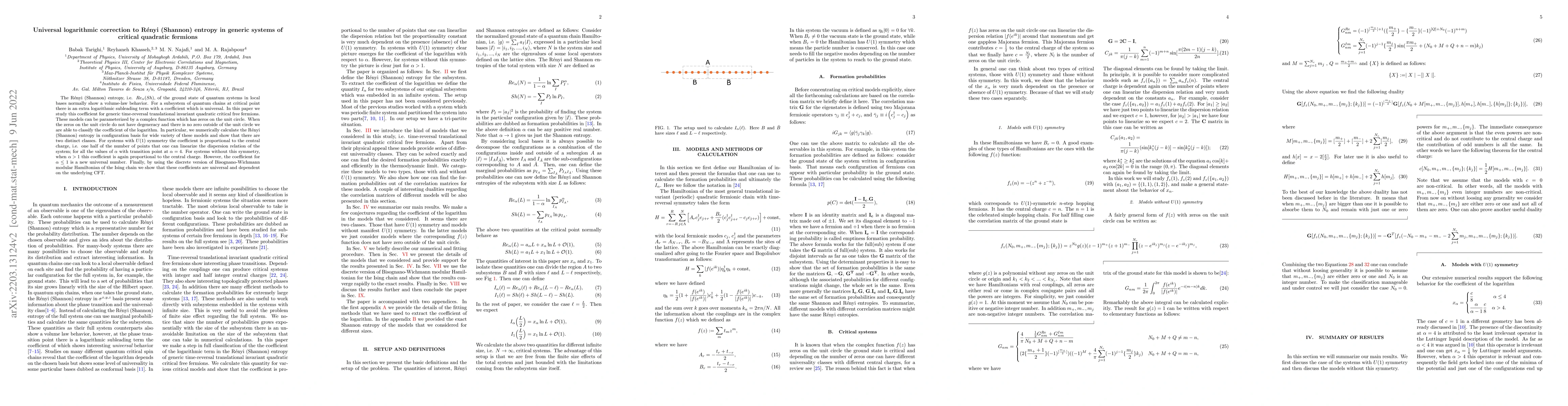 Researchers studied the Renyi-Shannon entropy of critical quadratic fermions in generic systems, finding two universal classes with different properties for systems with and without U(1) symmetry, and a new universal coefficient for systems with alpha less than or equal to 1.