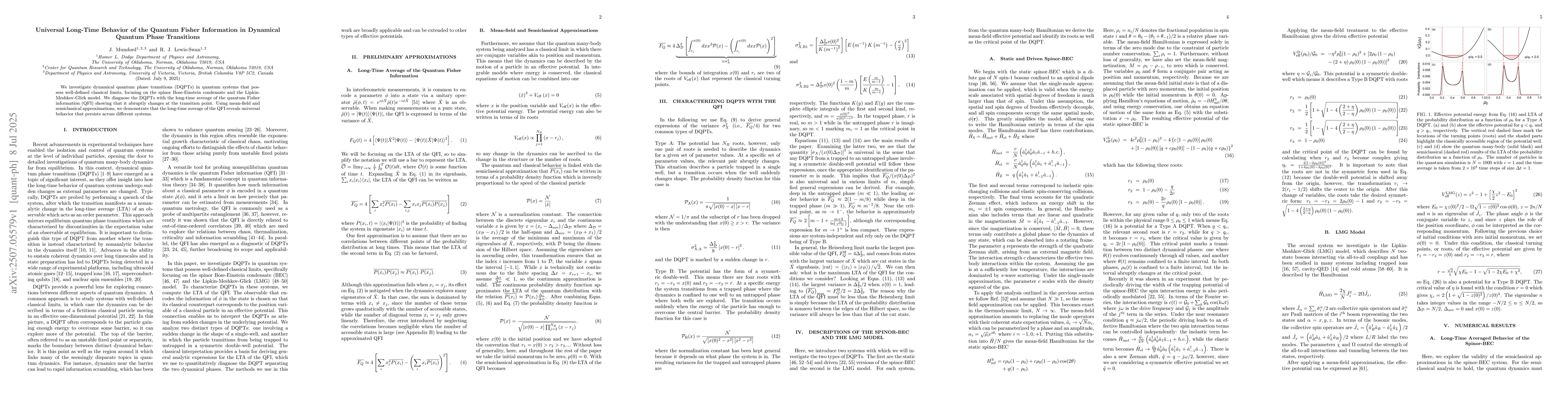 We investigate dynamical quantum phase transitions (DQPTs) in quantum systems that possess well-defined classical limits, focusing on the spinor Bose-Einstein condensate and the Lipkin-Meshkov-Glick model. We diagnose the DQPTs with the long-time average of the quantum Fisher information (QFI) showing that it abruptly changes at the transition point. Using mean-field and semiclassical approximations, we demonstrate that the long-time average of the QFI reveals universal behavior that persists across different systems.