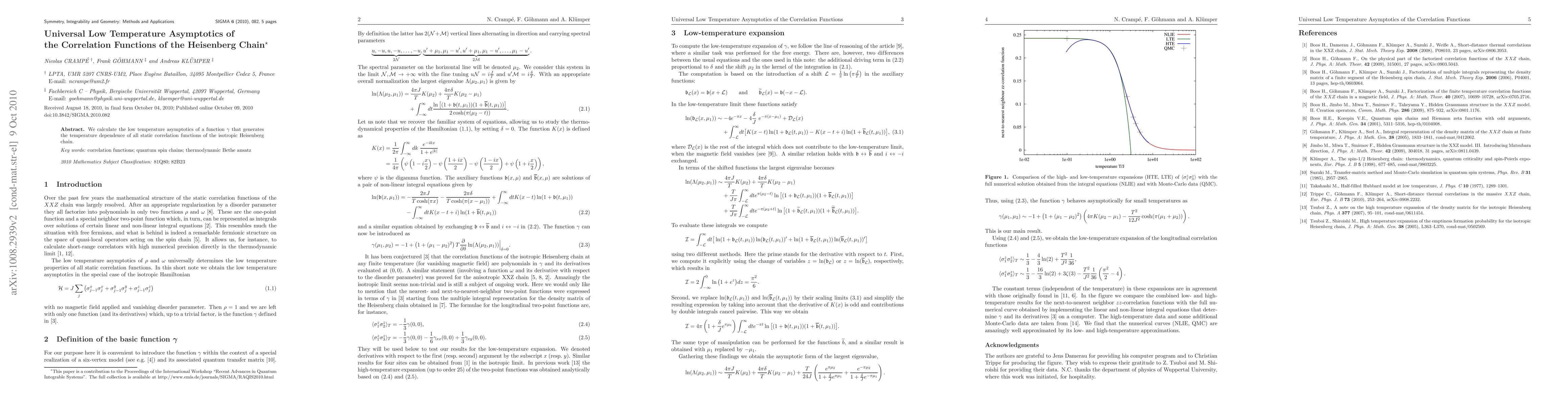 Summary: This paper determines the low temperature asymptotic behavior of a function $\gamma$ that governs the temperature dependence of static correlation functions in the isotropic Heisenberg chain, providing insights into the universal properties at low temperatures.