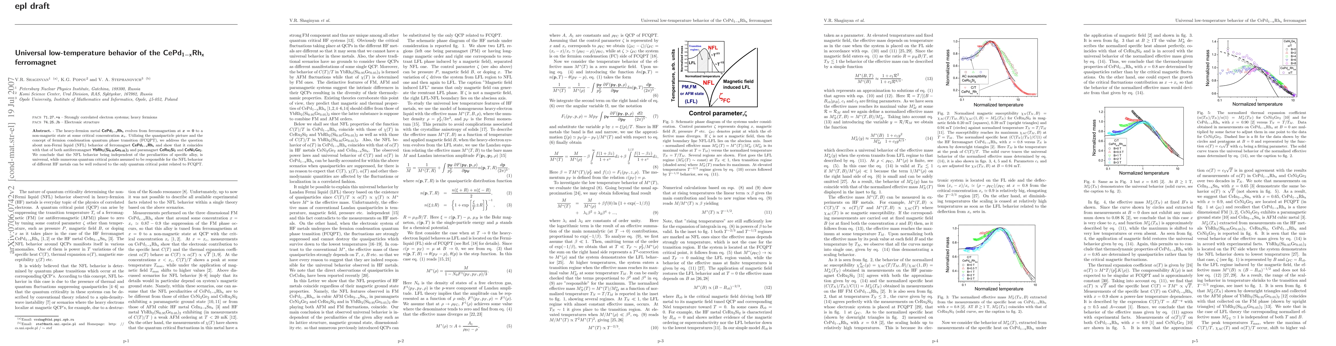 The heavy-fermion metal CePd_{1-x}Rh_x evolves from ferromagnetism at x=0 to a non-magnetic state at some critical concentration x_c. Utilizing the quasiparticle picture and the concept of fermion condensation quantum phase transition (FCQPT), we address the question about non-Fermi liquid (NFL) behavior of ferromagnet CePd_{1-x}Rh_x and show that it coincides with that of both antiferromagnet YbRh_2(Si_{0.95}Ge_{0.05})_2 and paramagnet CeRu_2Si_2 and CeNi_2Ge_2. We conclude that the NFL behavior being independent of the peculiarities of specific alloy, is universal, while numerous quantum critical points assumed to be responsible for the NFL behavior of different HF metals can be well reduced to the only quantum critical point related to FCQPT.