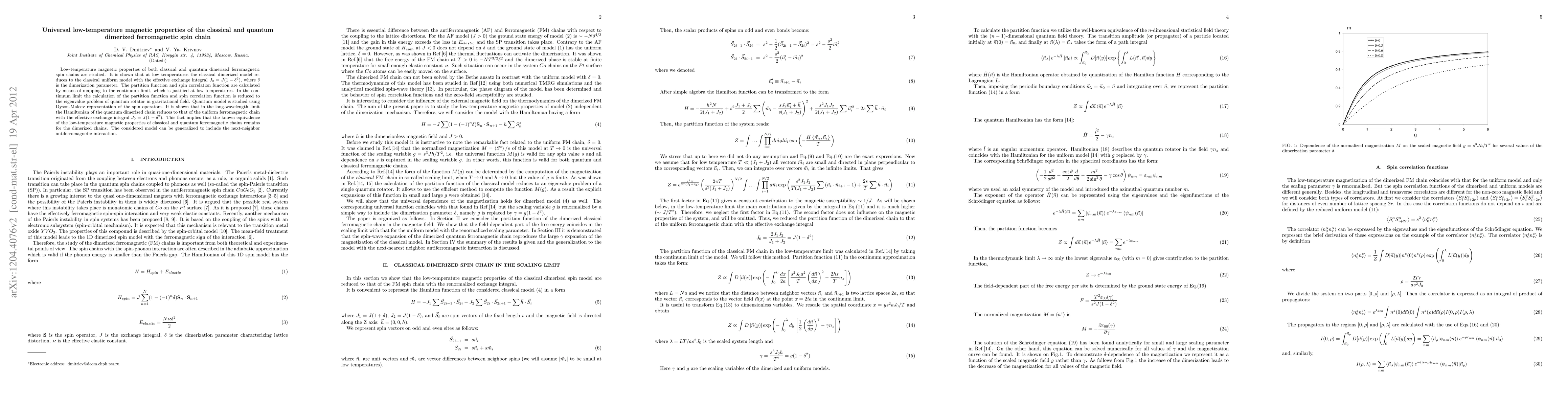 This paper investigates the low-temperature magnetic properties of classical and quantum dimerized ferromagnetic spin chains, demonstrating that both models converge to uniform chain behavior with an effective exchange integral $J_{0}=J(1-\delta^{2})$ at low temperatures, maintaining the equivalence of classical and quantum systems.