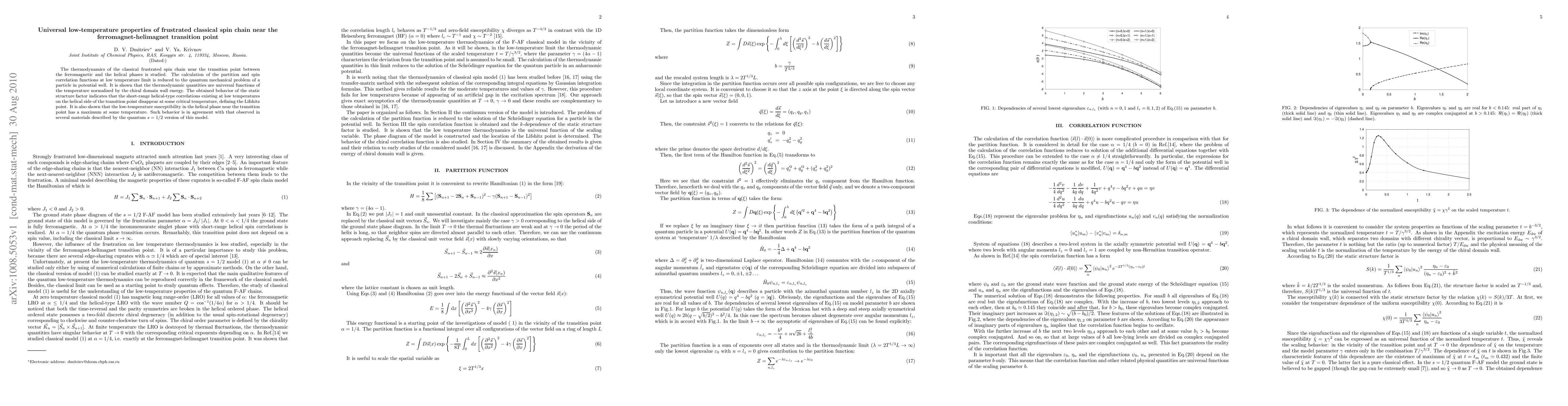 The thermodynamics of the classical frustrated spin chain near the transition point between the ferromagnetic and the helical phases is studied. The calculation of the partition and spin correlation functions at low temperature limit is reduced to the quantum mechanical problem of a particle in potential well. It is shown that the thermodynamic quantities are universal functions of the temperature normalized by the chiral domain wall energy. The obtained behavior of the static structure factor indicates that the short-range helical-type correlations existing at low temperatures on the helical side of the transition point disappear at some critical temperature, defining the Lifshitz point. It is also shown that the low-temperature susceptibility in the helical phase near the transition point has a maximum at some temperature. Such behavior is in agreement with that observed in several materials described by the quantum $s=1/2$ version of this model.