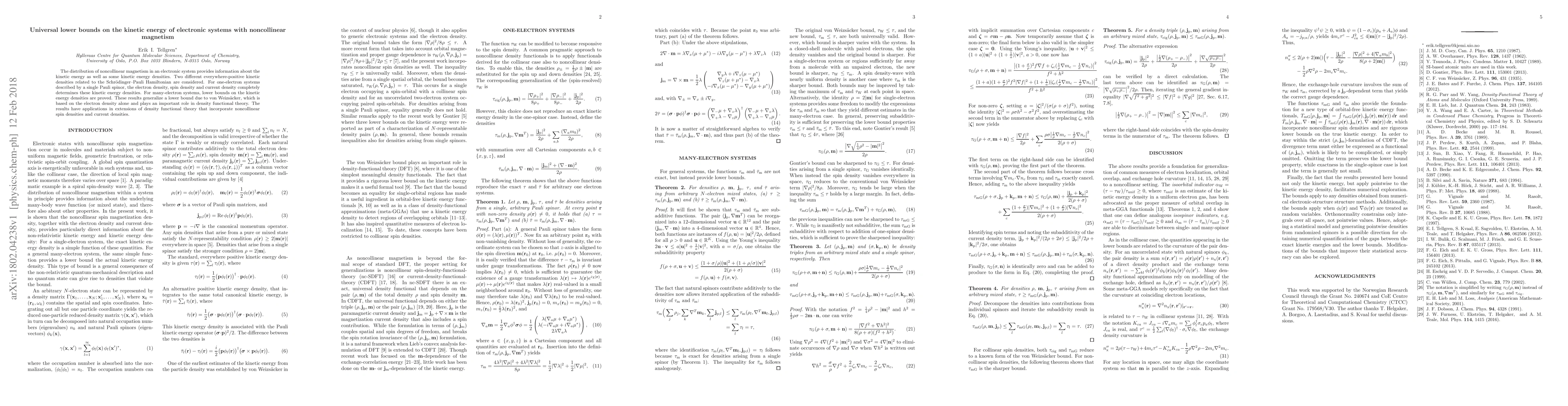 This paper establishes universal lower bounds on the kinetic energy of electronic systems with noncollinear magnetism, extending the von Weizsäcker lower bound to include spin and current densities. These findings have implications for advanced density functional theory that accounts for noncollinear spin densities.