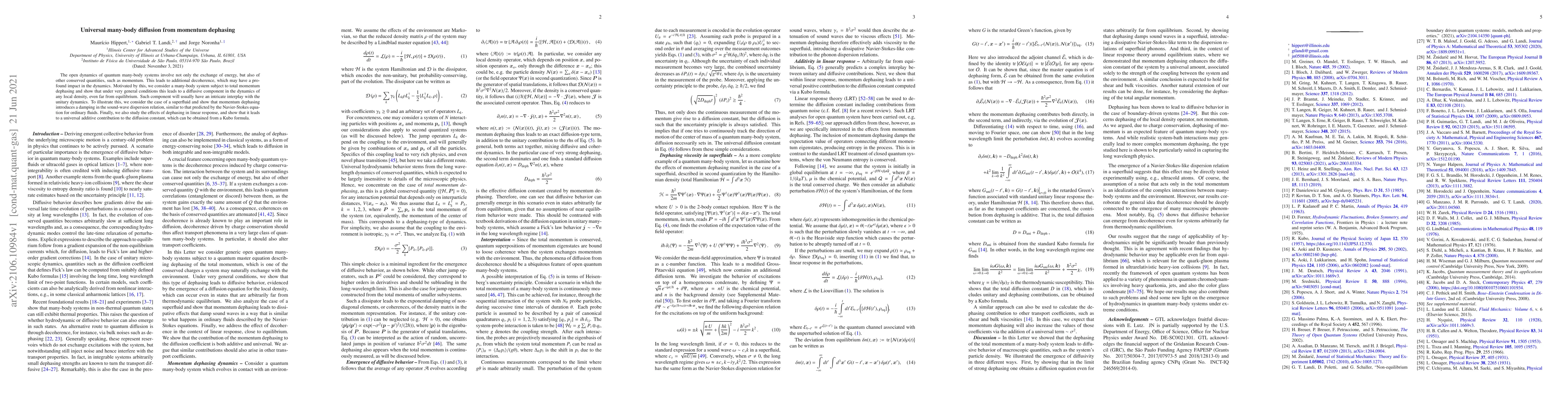 This paper investigates how momentum dephasing in quantum many-body systems induces a diffusive component in local density dynamics, even far from equilibrium. It demonstrates that such dephasing leads to a damping effect in superfluid sound-wave dispersion, akin to the Navier-Stokes model for ordinary fluids, and reveals a universal additive contribution to the diffusion constant derived from a Kubo formula.