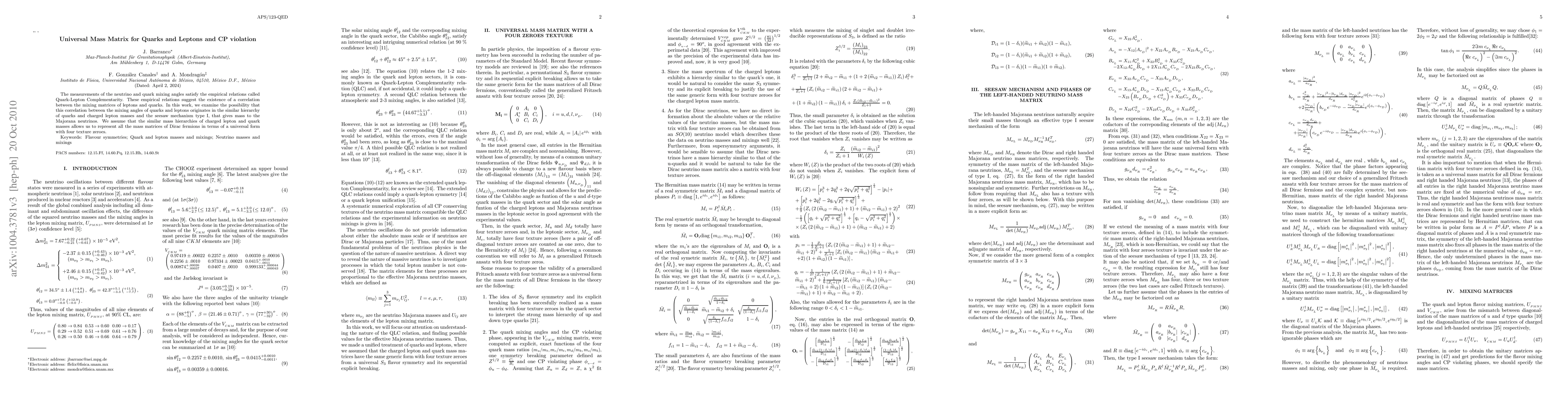 This paper explores the Quark-Lepton Complementarity relations and proposes that the observed correlations between neutrino and quark mixing angles arise from a universal mass texture with four texture zeroes. It suggests that similar hierarchies in quark and charged lepton masses could unify the mass matrices of Dirac fermions through a type I seesaw mechanism.