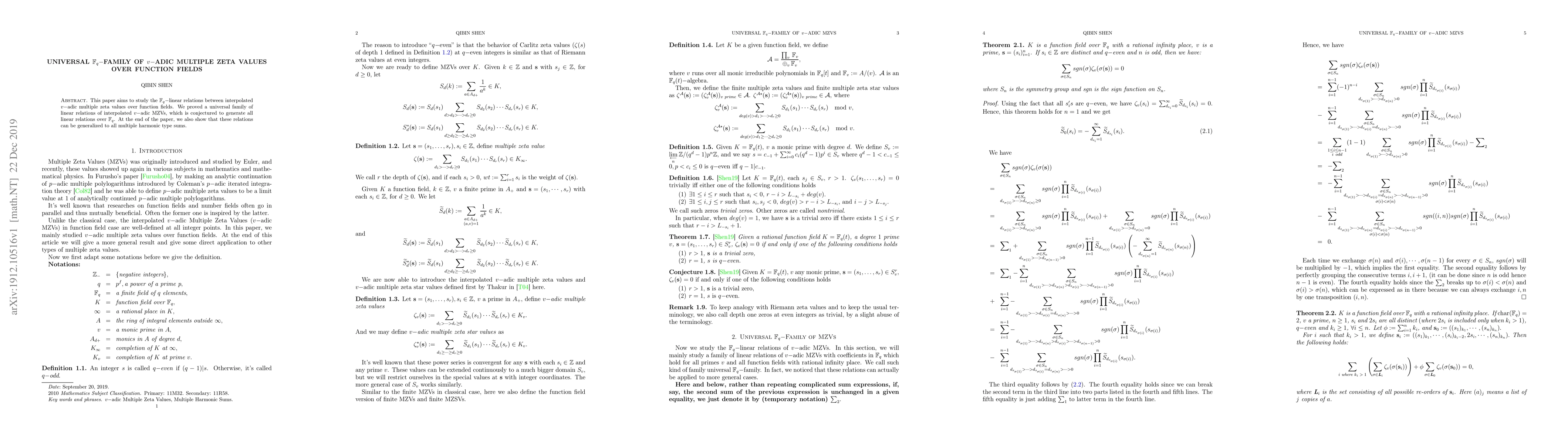 This paper investigates $\mathbb{F}_q-$linear relations among interpolated $v-$adic multiple zeta values over function fields, proving a universal family of such relations that is conjectured to encompass all such relations over $\mathbb{F}_q$. Additionally, it demonstrates the generalization of these relations to multiple harmonic type sums.
