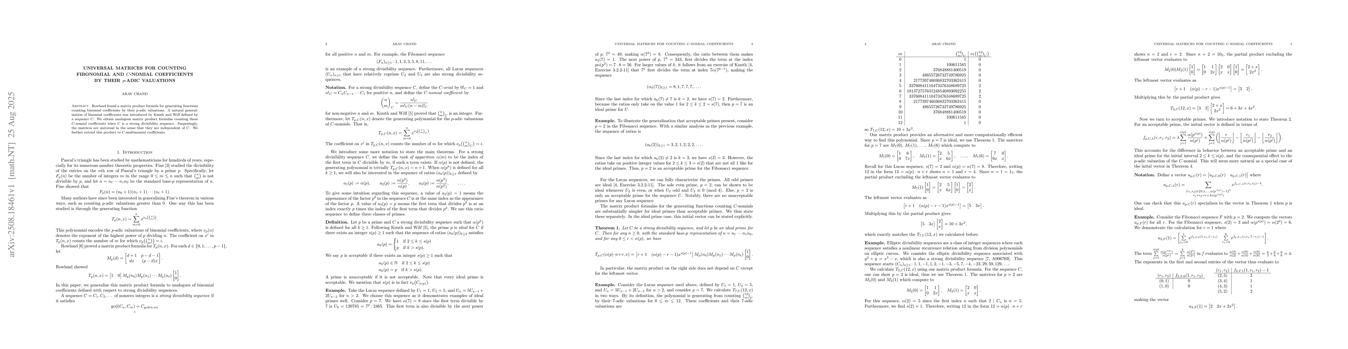 Rowland found a matrix product formula for generating functions counting binomial coefficients by their $p$-adic valuations. A natural generalization of binomial coefficients was introduced by Knuth and Wilf defined by a sequence $C$. We obtain analogous matrix product formulas counting these $C$-nomial coefficients when $C$ is a strong divisibility sequence. Surprisingly, the matrices are universal in the sense that they are independent of $C$. We further extend this product to $C$-multinomial coefficients.