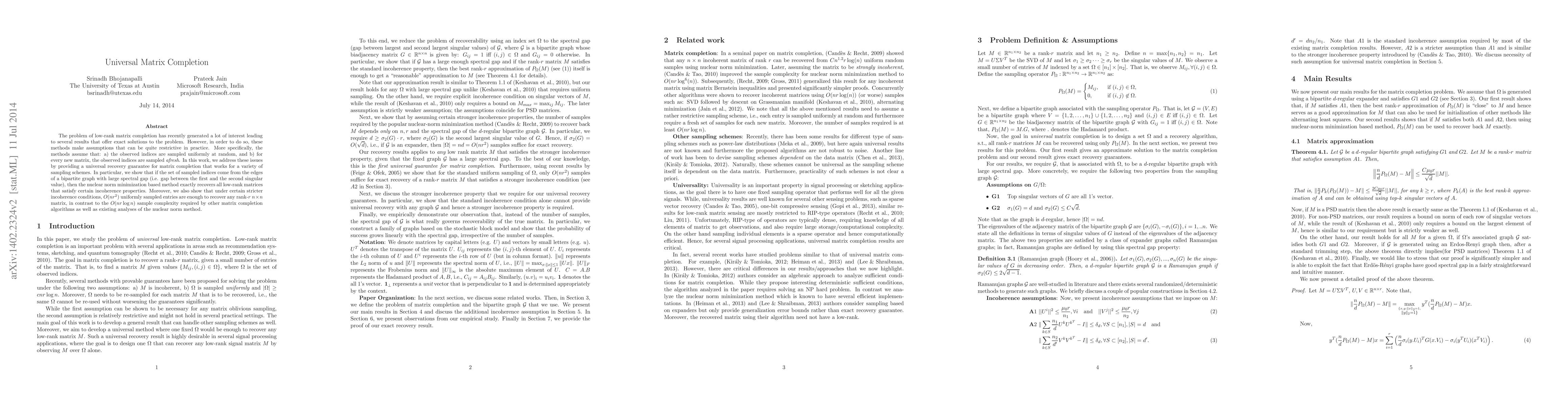 This paper proposes a universal matrix completion method that overcomes restrictive assumptions of previous techniques, ensuring exact recovery for various sampling schemes, particularly when indices follow a bipartite graph with a large spectral gap. It demonstrates that $O(nr^2)$ uniformly sampled entries can recover any rank-$r$ matrix, significantly reducing sample complexity compared to prior methods.