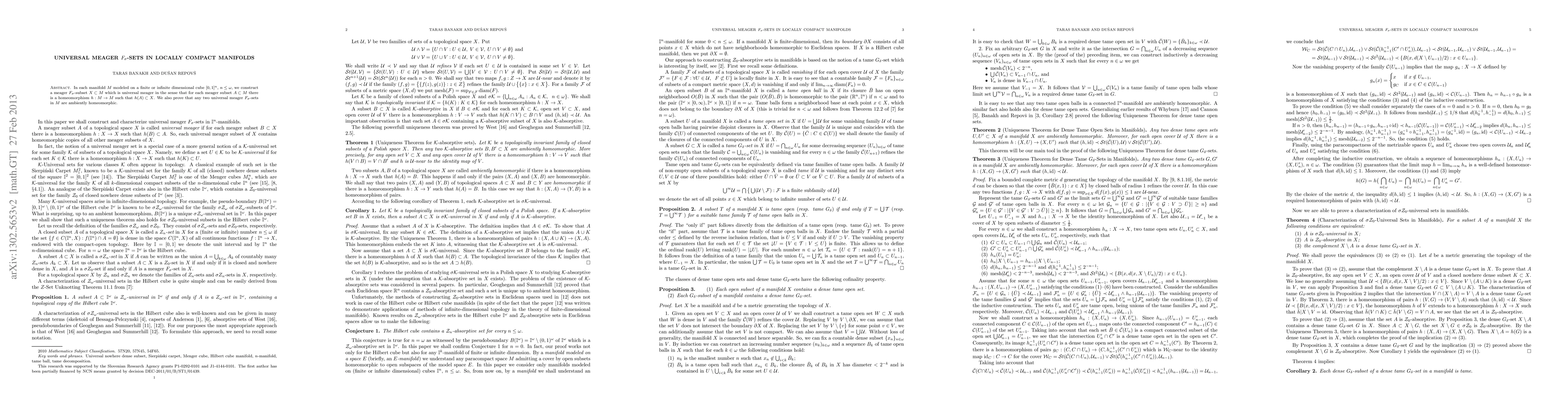This paper constructs a universal meager $F_\sigma$-set in any locally compact manifold modeled on a cube, demonstrating that any meager subset can be mapped to this set via a homeomorphism. It also proves that any two such universal meager $F_\sigma$-sets in the same manifold are ambiently homeomorphic.
