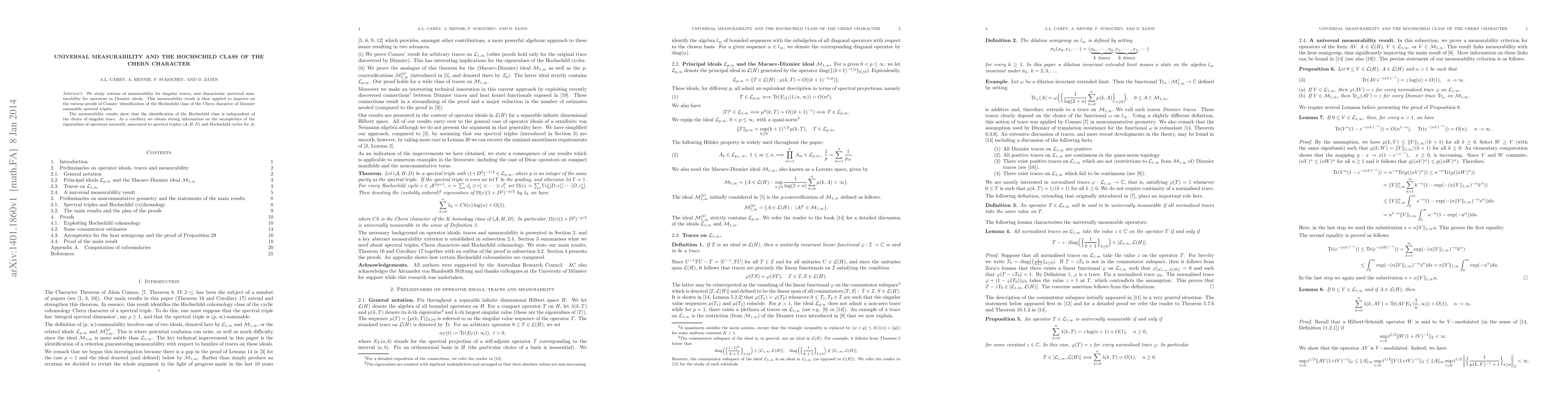 We study notions of measurability for singular traces, and characterise universal measurability for operators in Dixmier ideals. This measurability result is then applied to improve on the various proofs of Connes' identification of the Hochschild class of the Chern character of Dixmier summable spectral triples. The measurability results show that the identification of the Hochschild class is independent of the choice of singular trace. As a corollary we obtain strong information on the asymptotics of the eigenvalues of operators naturally associated to spectral triples (A,H,D) and Hochschild cycles for A.
