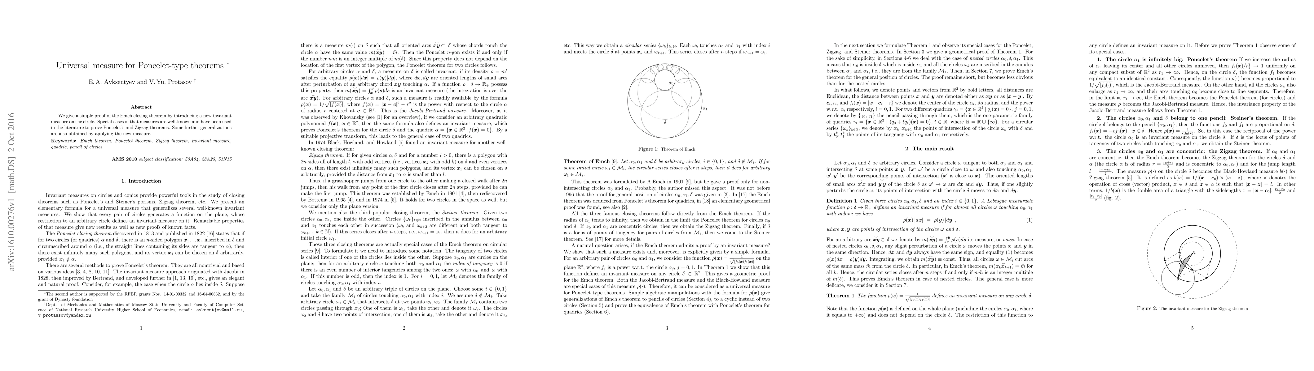 We give a simple proof of the Emch closing theorem by introducing a new invariant measure on the circle. Special cases of that measures are well-known and have been used in the literature to prove Poncelet's and Zigzag theorems. Some further generalizations are also obtained by applying the new measure.