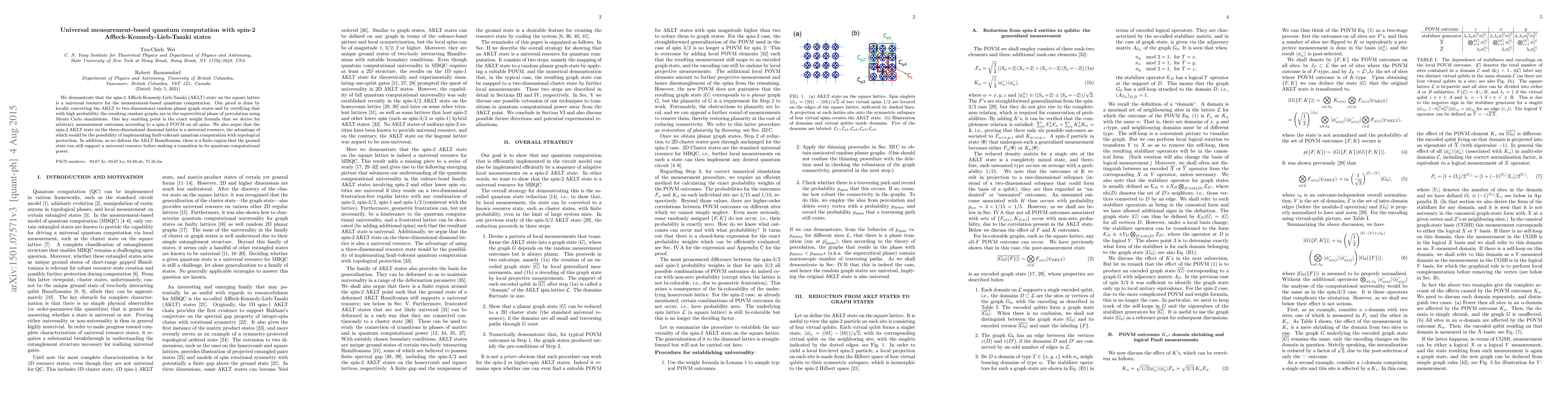 This paper demonstrates that the spin-2 Affleck-Kennedy-Lieb-Tasaki (AKLT) state on square and diamond lattices serves as a universal resource for measurement-based quantum computation, with the spin-2 AKLT state on the diamond lattice potentially enabling fault-tolerant quantum computation. The authors prove this through conversion to random planar graph states and Monte Carlo simulations.