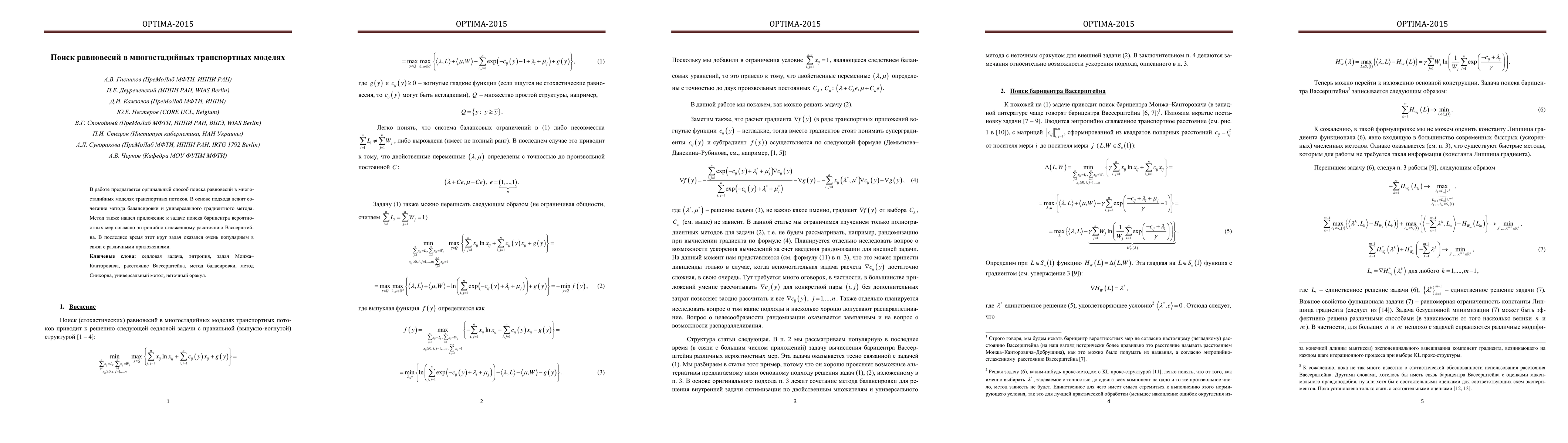 A new method combining Universal Gradient Method and inexact oracle is proposed for efficiently calculating equillibriums in multistage transport problems, with applications in optimizing Wasserstein's Barycenter.