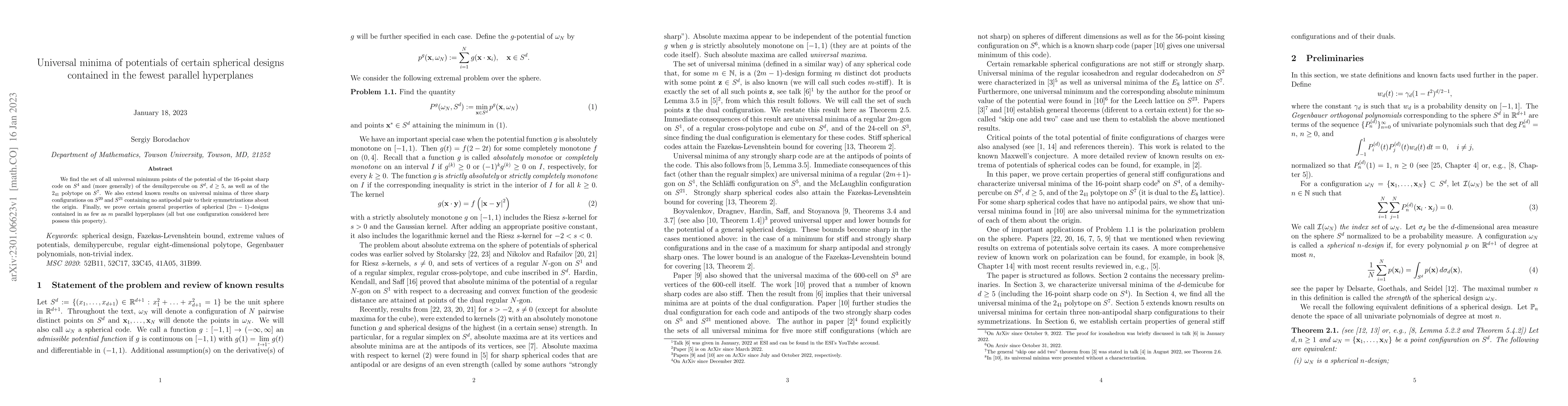 We find the set of all universal minimum points of the potential of the $16$-point sharp code on $S^4$ and (more generally) of the demihypercube on $S^d$, $d\geq 5$, as well as of the $2_{41}$ polytope on $S^7$. We also extend known results on universal minima of three sharp configurations on $S^{20}$ and $S^{21}$ containing no antipodal pair to their symmetrizations about the origin. Finally, we prove certain general properties of spherical $(2m-1)$-designs contained in as few as $m$ parallel hyperplanes (all but one configuration considered here possess this property).