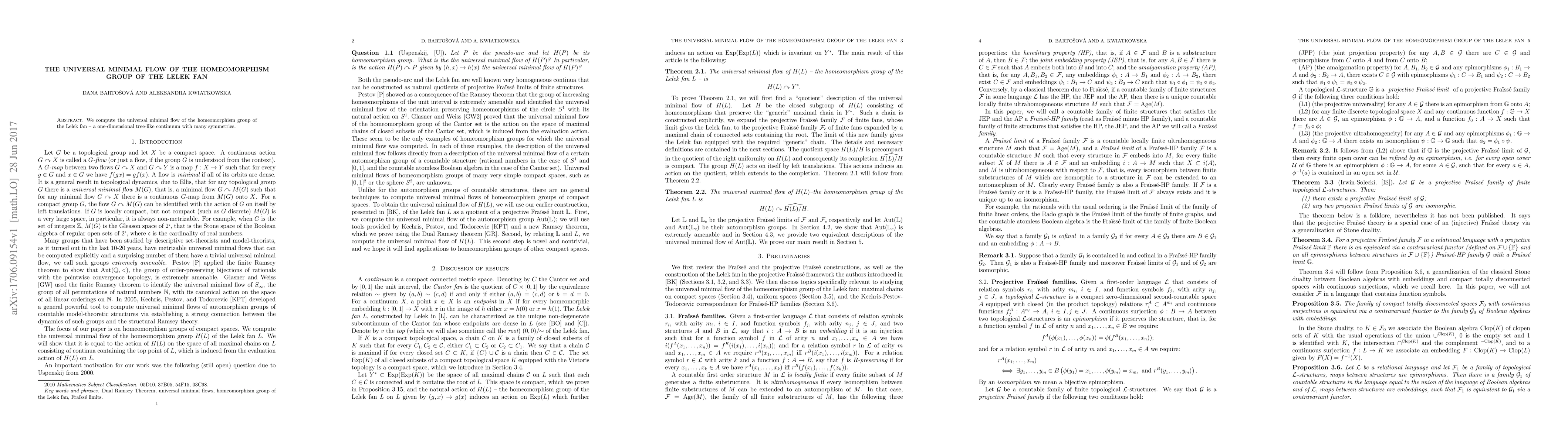 Summary: This paper determines the universal minimal flow of the homeomorphism group associated with the Lelek fan, revealing its symmetrical, tree-like structure and inherent topological properties. The findings provide deeper insights into the dynamics of such topological spaces.