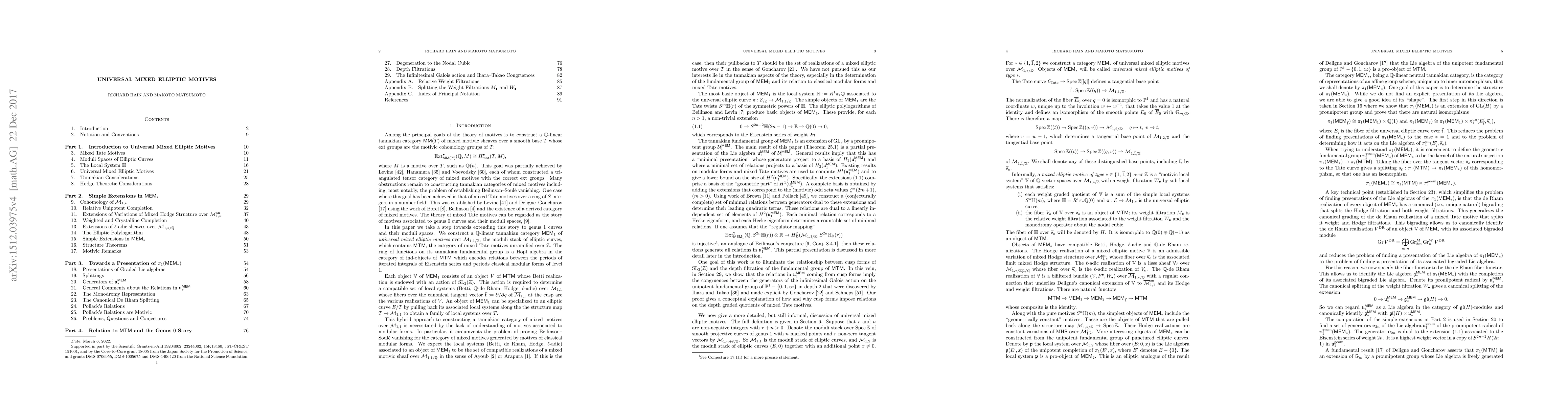 This paper constructs the tannakian category MEM_1 of universal mixed elliptic motives over the moduli space of elliptic curves, which includes mixed Tate motives. The study reveals the fundamental group structure and arithmetic relations, providing a new proof for the Ihara-Takao congruences.