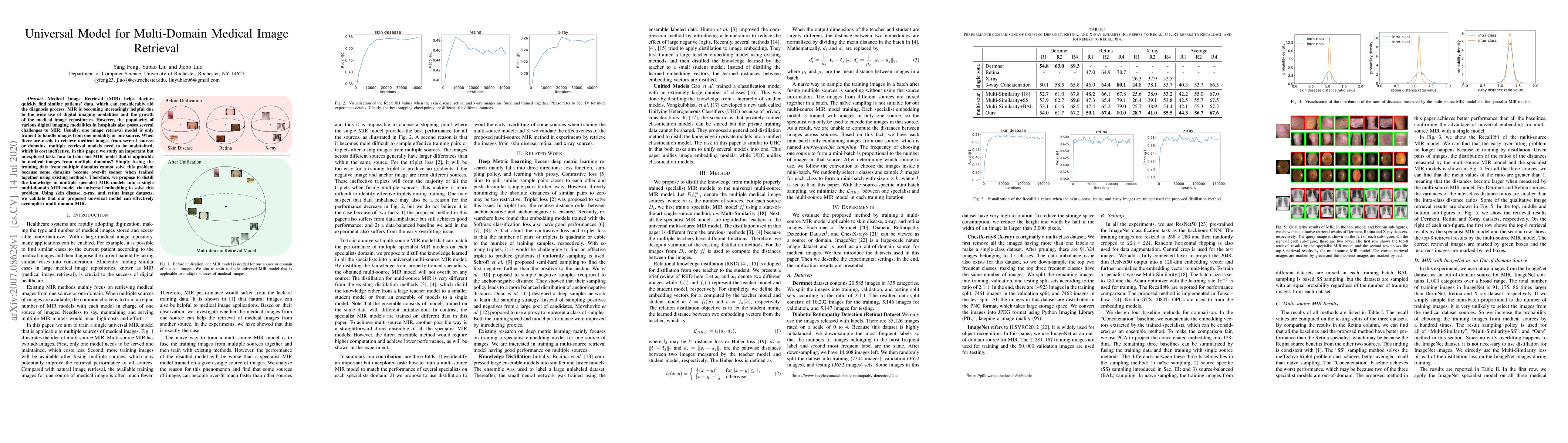 Medical Image Retrieval (MIR) helps doctors quickly find similar patients' data, which can considerably aid the diagnosis process. MIR is becoming increasingly helpful due to the wide use of digital imaging modalities and the growth of the medical image repositories. However, the popularity of various digital imaging modalities in hospitals also poses several challenges to MIR. Usually, one image retrieval model is only trained to handle images from one modality or one source. When there are needs to retrieve medical images from several sources or domains, multiple retrieval models need to be maintained, which is cost ineffective. In this paper, we study an important but unexplored task: how to train one MIR model that is applicable to medical images from multiple domains? Simply fusing the training data from multiple domains cannot solve this problem because some domains become over-fit sooner when trained together using existing methods. Therefore, we propose to distill the knowledge in multiple specialist MIR models into a single multi-domain MIR model via universal embedding to solve this problem. Using skin disease, x-ray, and retina image datasets, we validate that our proposed universal model can effectively accomplish multi-domain MIR.
