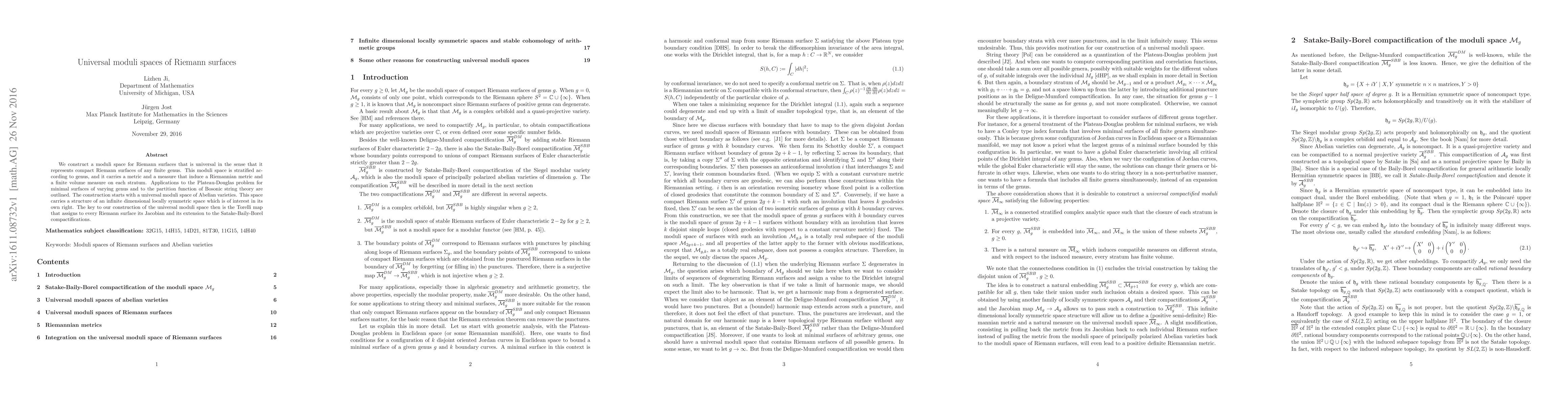 The paper constructs a universal moduli space for all compact Riemann surfaces of any finite genus, stratified by genus and equipped with a metric and measure, with applications to minimal surfaces and string theory. The construction leverages a Torelli map linking Riemann surfaces to their Jacobians and compactifications.