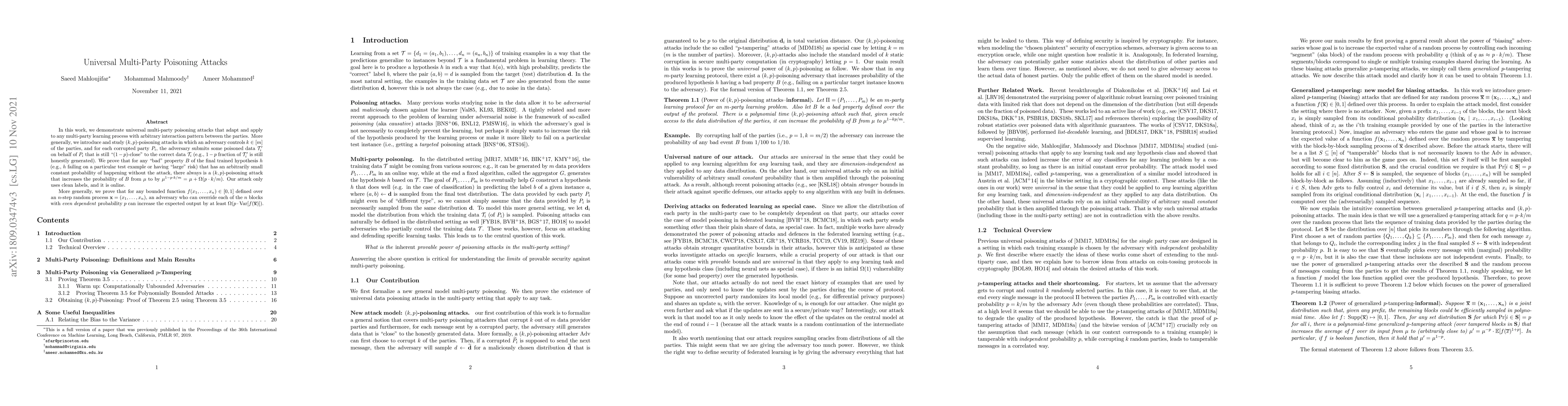 In this work, we demonstrate universal multi-party poisoning attacks that adapt and apply to any multi-party learning process with arbitrary interaction pattern between the parties. More generally, we introduce and study $(k,p)$-poisoning attacks in which an adversary controls $k\in[m]$ of the parties, and for each corrupted party $P_i$, the adversary submits some poisoned data $\mathcal{T}'_i$ on behalf of $P_i$ that is still ``$(1-p)$-close'' to the correct data $\mathcal{T}_i$ (e.g., $1-p$ fraction of $\mathcal{T}'_i$ is still honestly generated). We prove that for any ``bad'' property $B$ of the final trained hypothesis $h$ (e.g., $h$ failing on a particular test example or having ``large'' risk) that has an arbitrarily small constant probability of happening without the attack, there always is a $(k,p)$-poisoning attack that increases the probability of $B$ from $\mu$ to by $\mu^{1-p \cdot k/m} = \mu + \Omega(p \cdot k/m)$. Our attack only uses clean labels, and it is online. More generally, we prove that for any bounded function $f(x_1,\dots,x_n) \in [0,1]$ defined over an $n$-step random process $\mathbf{X} = (x_1,\dots,x_n)$, an adversary who can override each of the $n$ blocks with even dependent probability $p$ can increase the expected output by at least $\Omega(p \cdot \mathrm{Var}[f(\mathbf{x})])$.