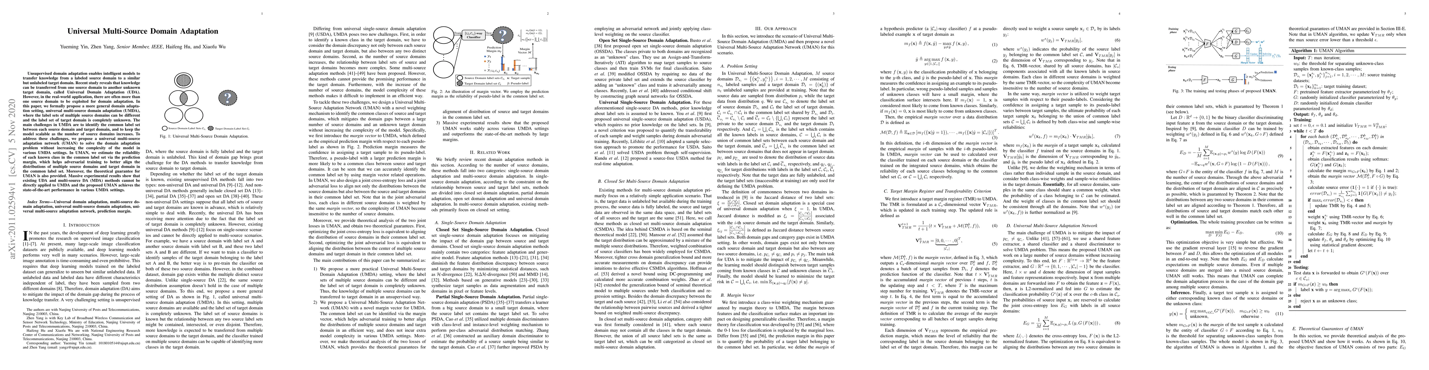 This paper proposes a universal multi-source domain adaptation (UMDA) framework to address the challenge of transferring knowledge from multiple source domains with different label sets to an unknown target domain. The proposed universal multi-source adaptation network (UMAN) effectively aligns domain distributions and achieves state-of-the-art performance without increasing model complexity.