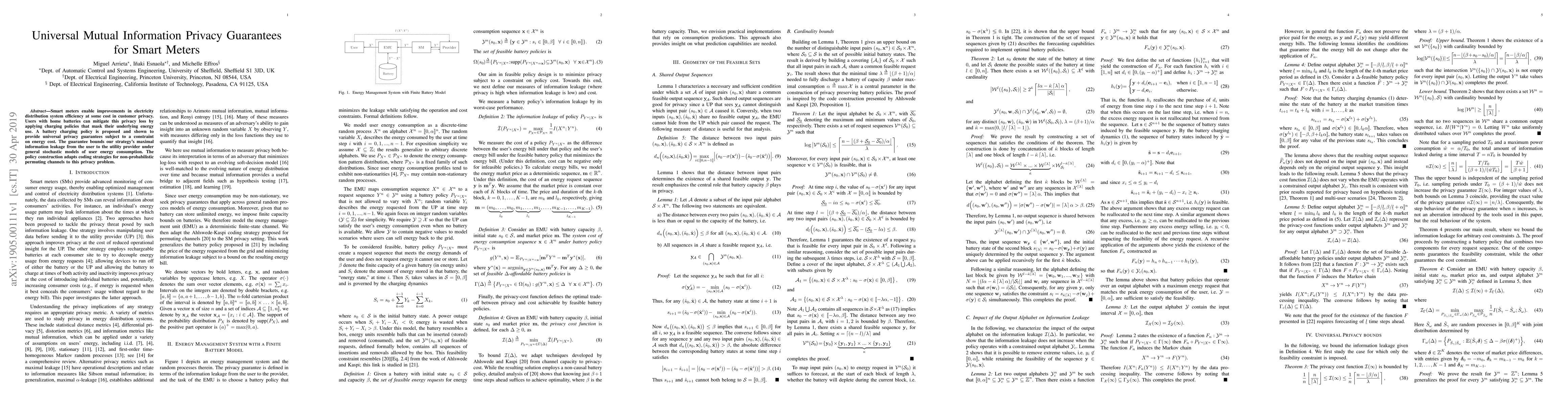 This paper proposes a battery charging policy to enhance privacy for smart meters, ensuring universal mutual information privacy guarantees while limiting energy costs. The strategy adapts coding techniques from non-probabilistic permuting channels to control the information leakage from users to utility providers.