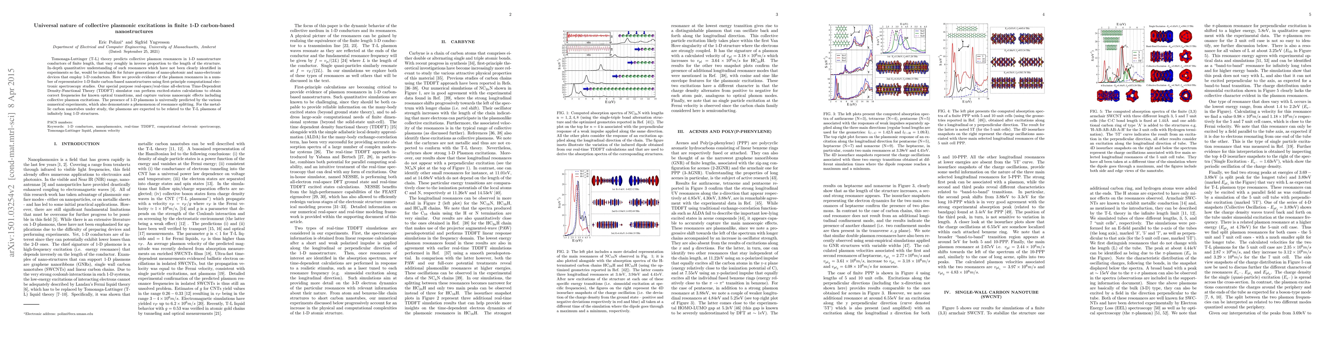This paper demonstrates the existence of collective plasmon resonances in finite 1-D carbon-based nanostructures using advanced computational methods, supporting the Tomonaga-Luttinger theory predictions and highlighting resonance splitting phenomena. These findings are crucial for advancing nano-photonic and nano-electronic devices.