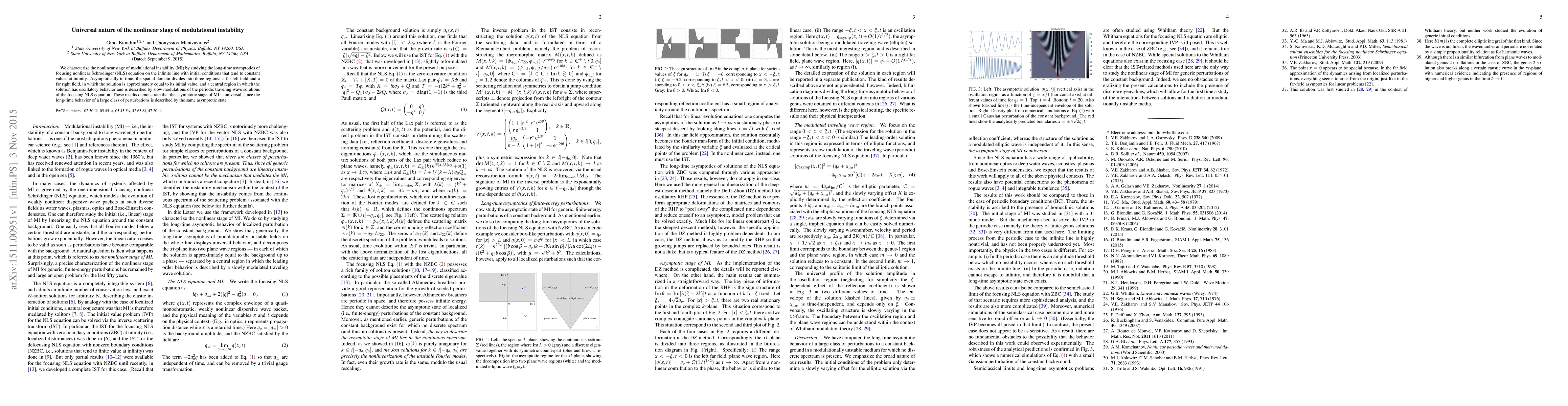 This paper investigates the nonlinear stage of modulational instability in the focusing nonlinear Schrödinger equation, revealing that the long-time behavior is universal across a broad class of perturbations, characterized by three distinct spatial regions with predictable asymptotic states.