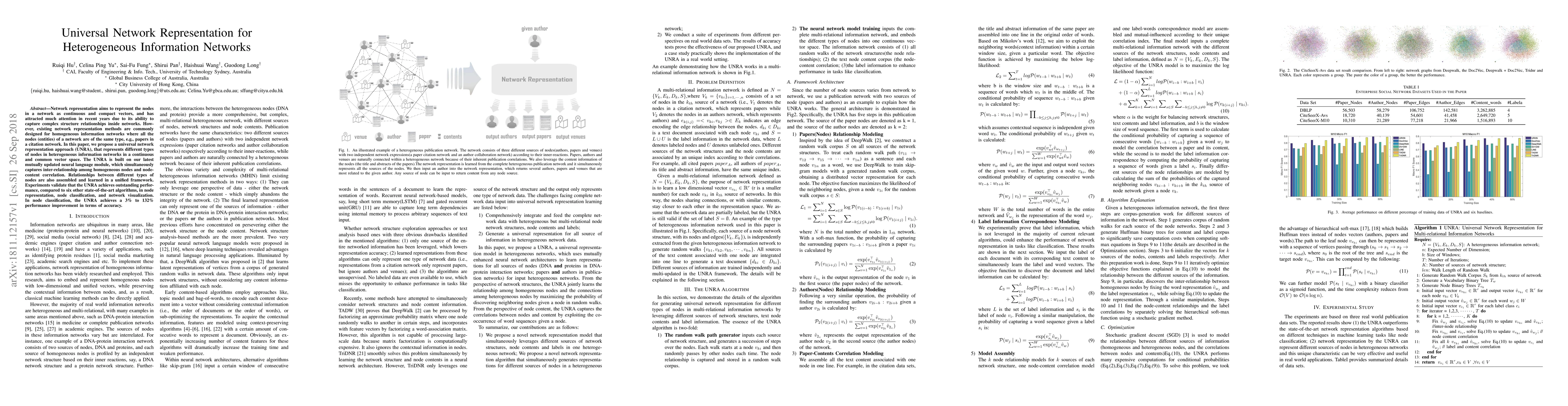 This paper proposes UNRA, a universal network representation approach for heterogeneous information networks, which captures complex relationships and node-content correlations in a unified vector space. Experiments show UNRA outperforms other methods in node representation, classification, and visualization, achieving up to 132% accuracy improvement in node classification.