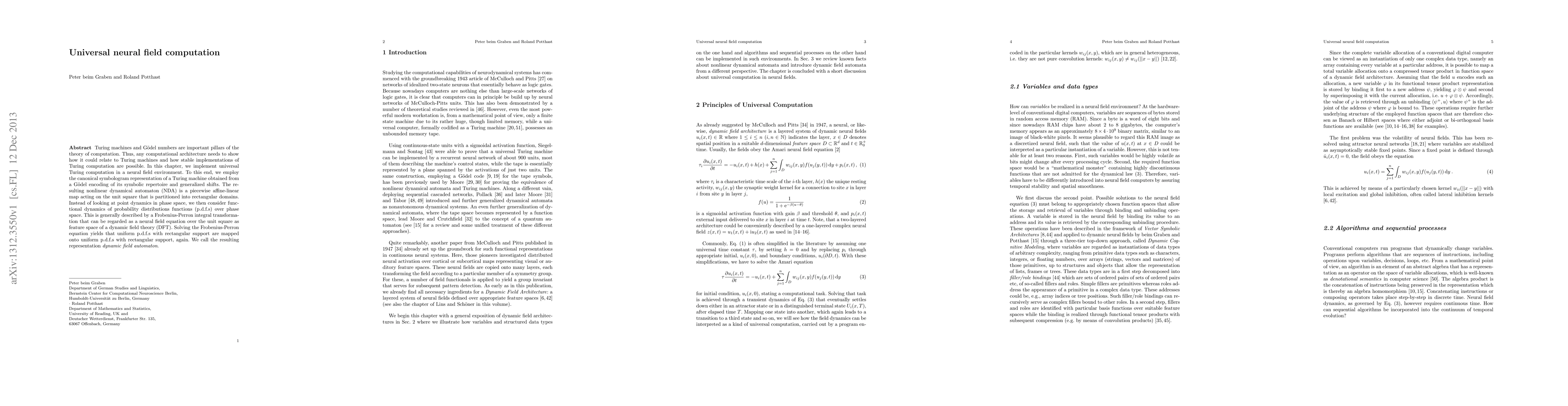 Turing machines and G\"odel numbers are important pillars of the theory of computation. Thus, any computational architecture needs to show how it could relate to Turing machines and how stable implementations of Turing computation are possible. In this chapter, we implement universal Turing computation in a neural field environment. To this end, we employ the canonical symbologram representation of a Turing machine obtained from a G\"odel encoding of its symbolic repertoire and generalized shifts. The resulting nonlinear dynamical automaton (NDA) is a piecewise affine-linear map acting on the unit square that is partitioned into rectangular domains. Instead of looking at point dynamics in phase space, we then consider functional dynamics of probability distributions functions (p.d.f.s) over phase space. This is generally described by a Frobenius-Perron integral transformation that can be regarded as a neural field equation over the unit square as feature space of a dynamic field theory (DFT). Solving the Frobenius-Perron equation yields that uniform p.d.f.s with rectangular support are mapped onto uniform p.d.f.s with rectangular support, again. We call the resulting representation \emph{dynamic field automaton}.