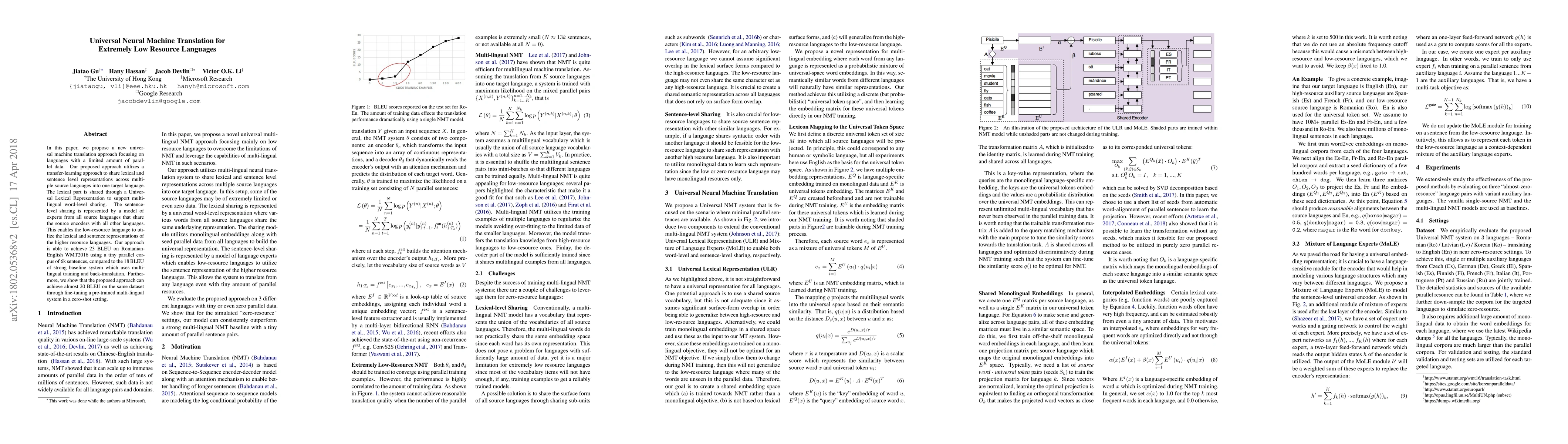 In this paper, we propose a new universal machine translation approach focusing on languages with a limited amount of parallel data. Our proposed approach utilizes a transfer-learning approach to share lexical and sentence level representations across multiple source languages into one target language. The lexical part is shared through a Universal Lexical Representation to support multilingual word-level sharing. The sentence-level sharing is represented by a model of experts from all source languages that share the source encoders with all other languages. This enables the low-resource language to utilize the lexical and sentence representations of the higher resource languages. Our approach is able to achieve 23 BLEU on Romanian-English WMT2016 using a tiny parallel corpus of 6k sentences, compared to the 18 BLEU of strong baseline system which uses multilingual training and back-translation. Furthermore, we show that the proposed approach can achieve almost 20 BLEU on the same dataset through fine-tuning a pre-trained multi-lingual system in a zero-shot setting.