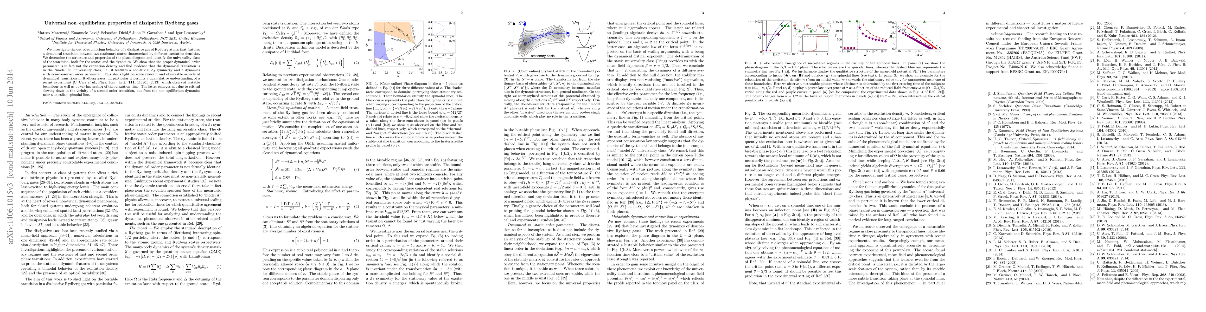 This paper explores the non-equilibrium dynamics of a dissipative Rydberg gas, identifying a dynamical transition between two stationary states and classifying it as belonging to the "model A" universality class. The study reveals that the transition features a non-trivial $\mathbb{Z}_2$ symmetry and non-conserved order parameter, providing insights into recent experimental observations of bistable behavior and power-law relaxation times.