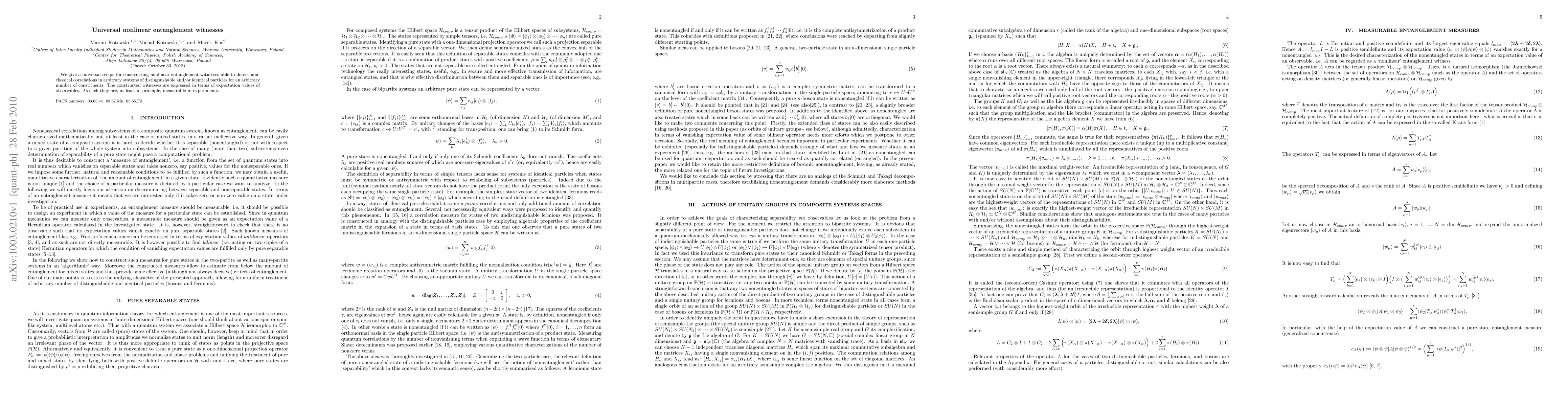 This paper presents a universal method for creating nonlinear entanglement witnesses that can detect non-classical correlations in any system of distinguishable or identical particles, regardless of the number of constituents. These witnesses are based on measurable expectation values of observables.