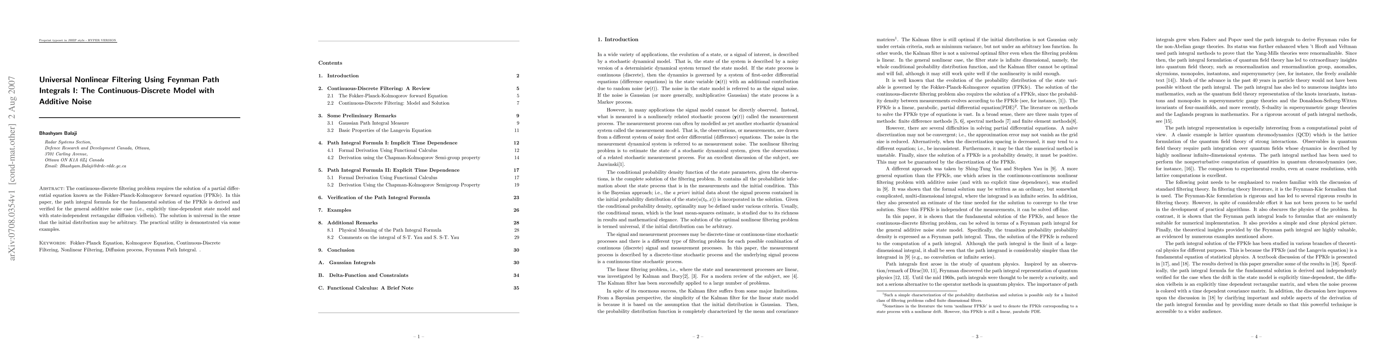 The continuous-discrete filtering problem requires the solution of a partial differential equation known as the Fokker-Planck-Kolmogorov forward equation (FPKfe). In this paper, the path integral formula for the fundamental solution of the FPKfe is derived and verified for the general additive noise case (i.e., explicitly time-dependent state model and with state-independent rectangular diffusion vielbein). The solution is universal in the sense that the initial distribution may be arbitrary. The practical utility is demonstrated via some examples.