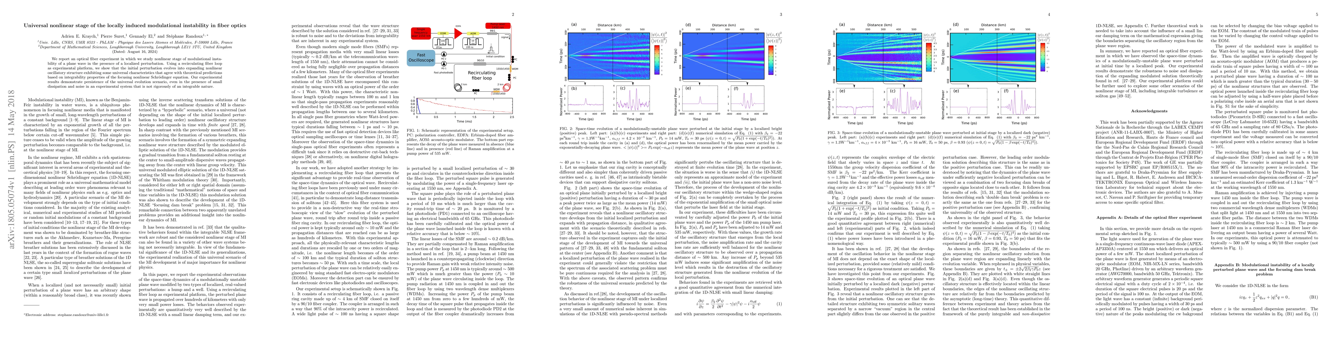 This paper reports on an optical fiber experiment investigating the nonlinear stage of modulational instability under localized perturbations. The study shows that initial perturbations evolve into universal nonlinear oscillatory structures, consistent with theoretical predictions based on the integrable nature of the focusing nonlinear Schrödinger equation, despite the presence of small dissipation and noise.