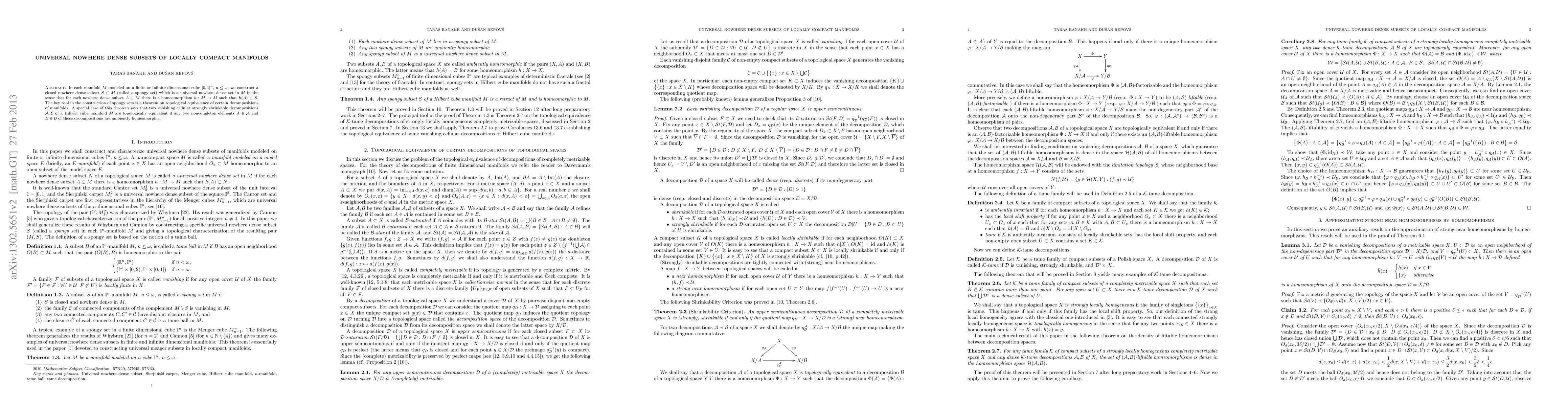 This paper constructs closed nowhere dense subsets (spongy sets) in locally compact manifolds modeled on cubes, which are universal for nowhere dense sets. The construction leverages a theorem on the topological equivalence of certain manifold decompositions, proving that any nowhere dense subset can be mapped homeomorphically into a spongy set.