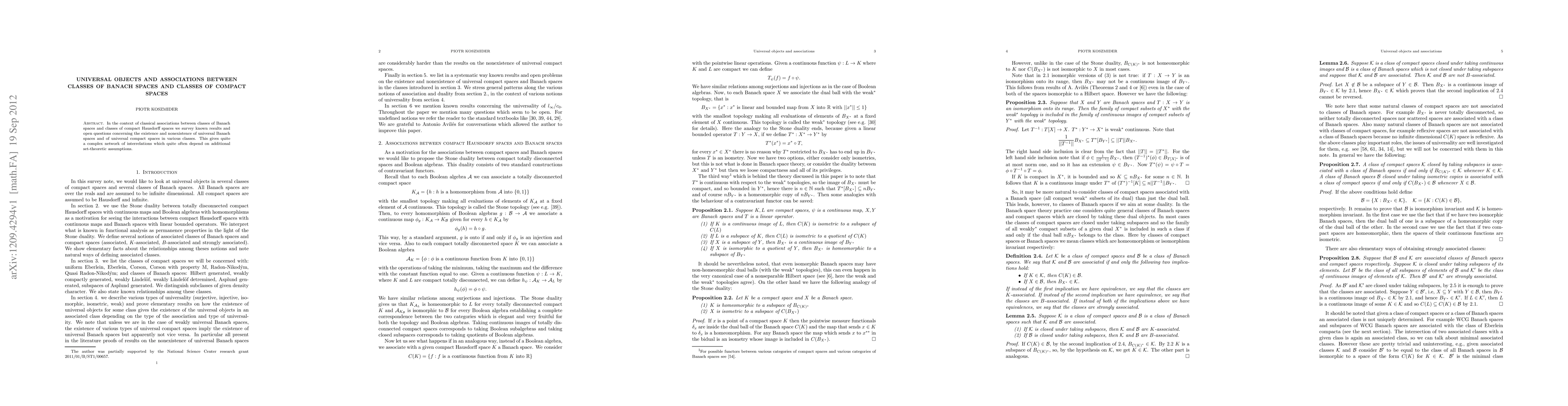 Summary: This paper surveys known associations between Banach spaces and compact Hausdorff spaces, focusing on the existence and nonexistence of universal objects within these classes, highlighting the complexity of interrelations often contingent on set-theoretic assumptions. Open questions remain regarding these universal entities.