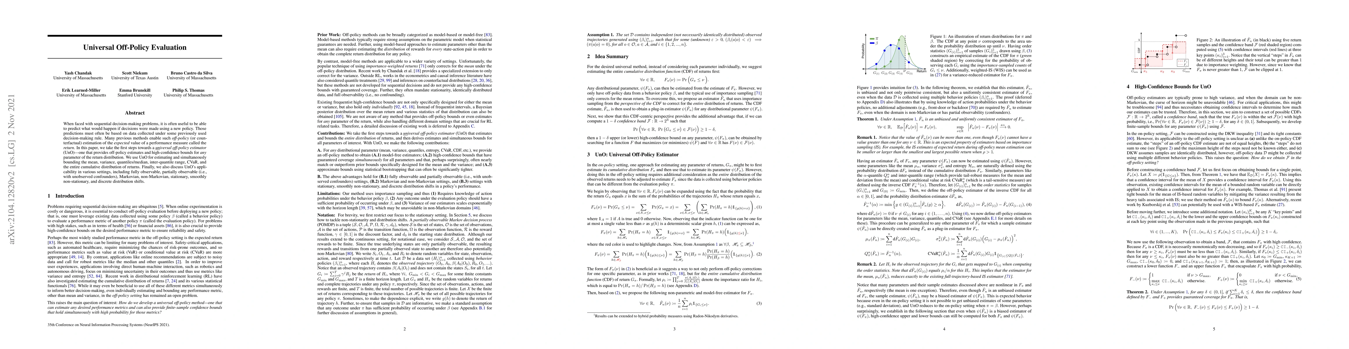 When faced with sequential decision-making problems, it is often useful to be able to predict what would happen if decisions were made using a new policy. Those predictions must often be based on data collected under some previously used decision-making rule. Many previous methods enable such off-policy (or counterfactual) estimation of the expected value of a performance measure called the return. In this paper, we take the first steps towards a universal off-policy estimator (UnO) -- one that provides off-policy estimates and high-confidence bounds for any parameter of the return distribution. We use UnO for estimating and simultaneously bounding the mean, variance, quantiles/median, inter-quantile range, CVaR, and the entire cumulative distribution of returns. Finally, we also discuss Uno's applicability in various settings, including fully observable, partially observable (i.e., with unobserved confounders), Markovian, non-Markovian, stationary, smoothly non-stationary, and discrete distribution shifts.