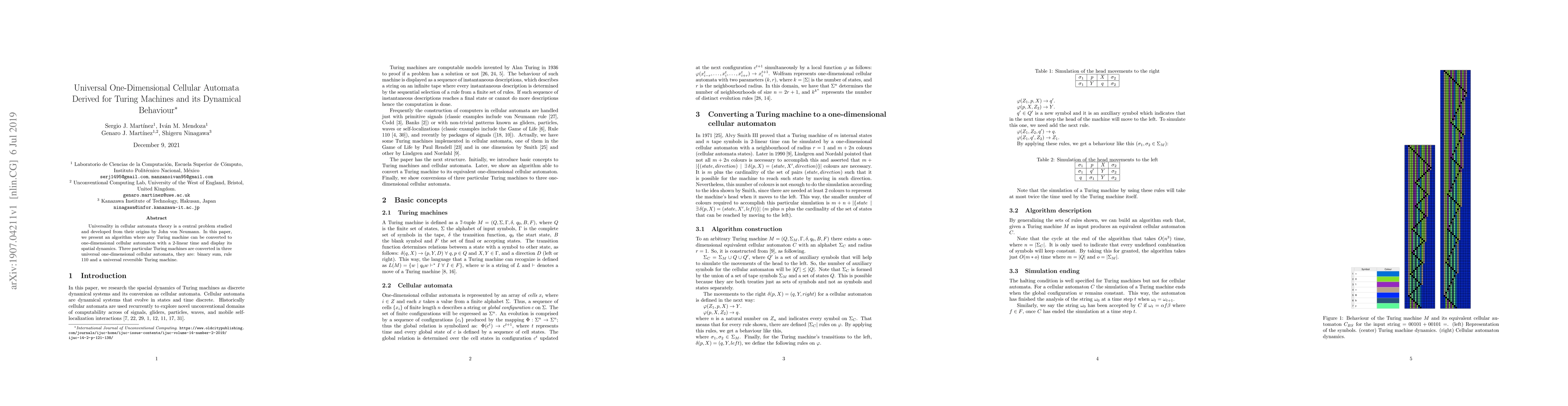 This paper introduces an algorithm converting any Turing machine into a one-dimensional cellular automaton in 2-linear time, demonstrating its spatial dynamics. Three specific Turing machines—binary sum, rule 110, and a universal reversible Turing machine—are converted into corresponding universal one-dimensional cellular automata.