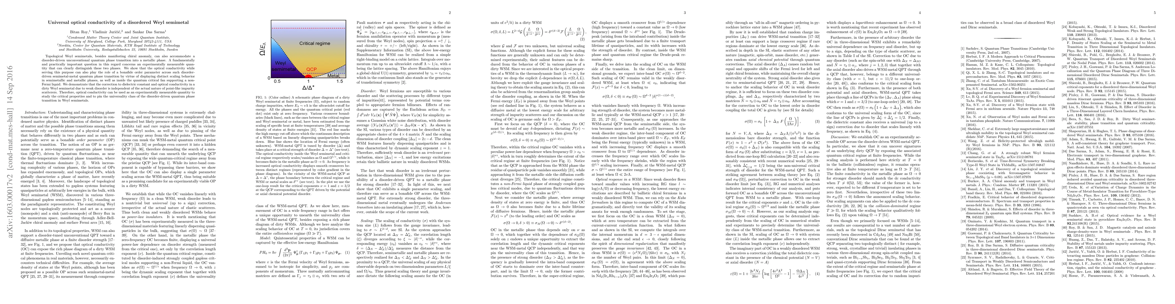 This paper demonstrates that optical conductivity serves as a key measurable quantity to distinguish between semimetallic and metallic phases in disordered Weyl semimetals, exhibiting distinct scaling behaviors. It also highlights optical conductivity as a universal order parameter for studying the critical properties and universality class of the disorder-driven quantum phase transition in these materials.