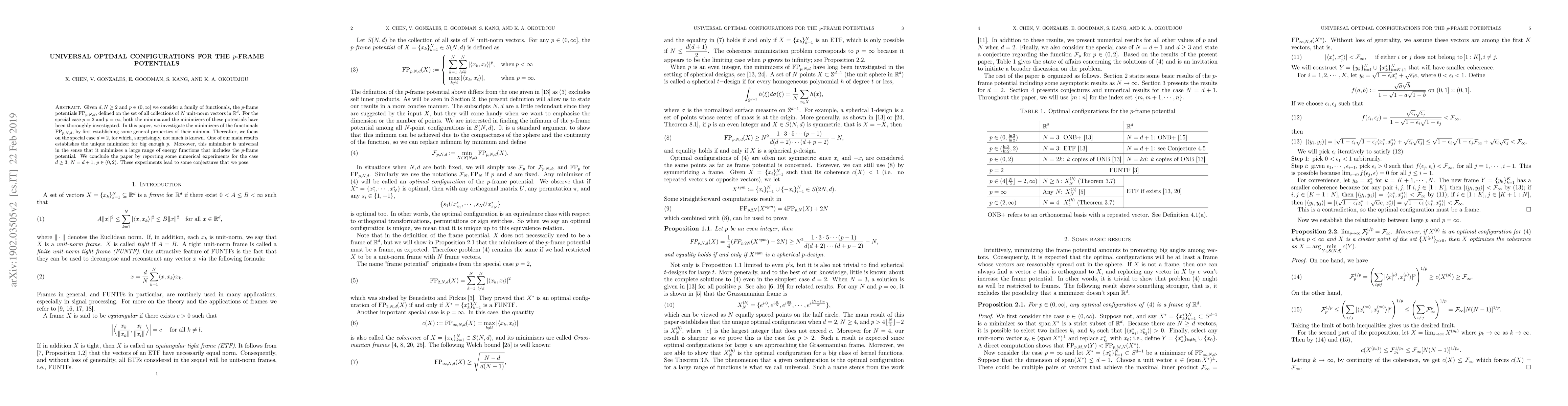 This paper explores the minimizers of $p$-frame potentials for collections of unit-norm vectors in $\mathbb R^d$, establishing general properties of their minima. It finds a unique universal minimizer for sufficiently large $p$ in the case $d=2$, and reports numerical experiments for higher dimensions that lead to conjectures.