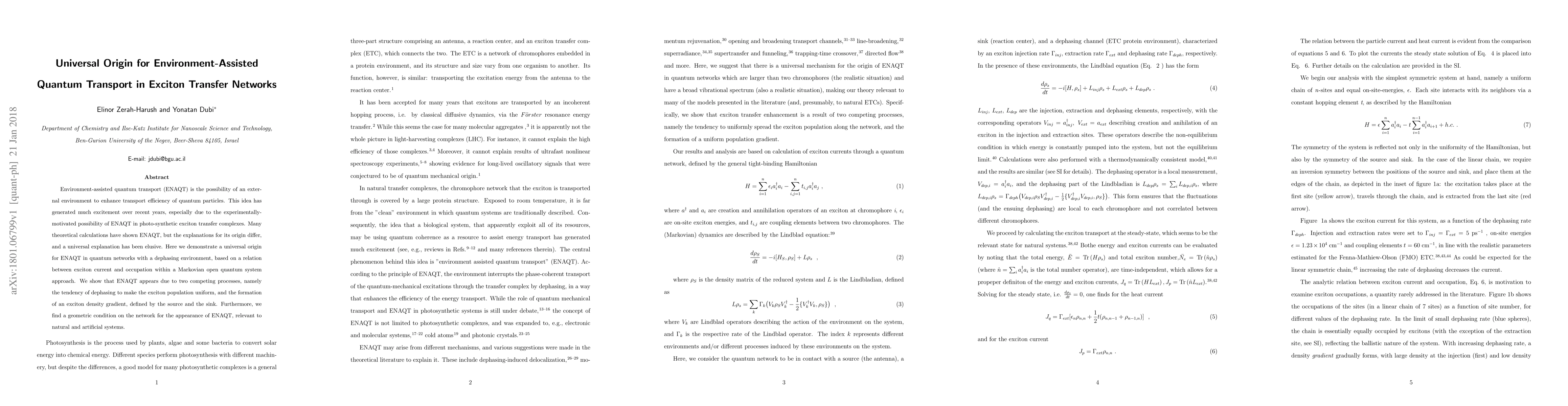 This paper presents a universal mechanism for environment-assisted quantum transport (ENAQT) in exciton transfer networks, revealing that ENAQT arises from the interplay between dephasing-induced uniform exciton population and exciton density gradient formation. The study identifies a geometric condition for ENAQT applicable to both natural and artificial systems.