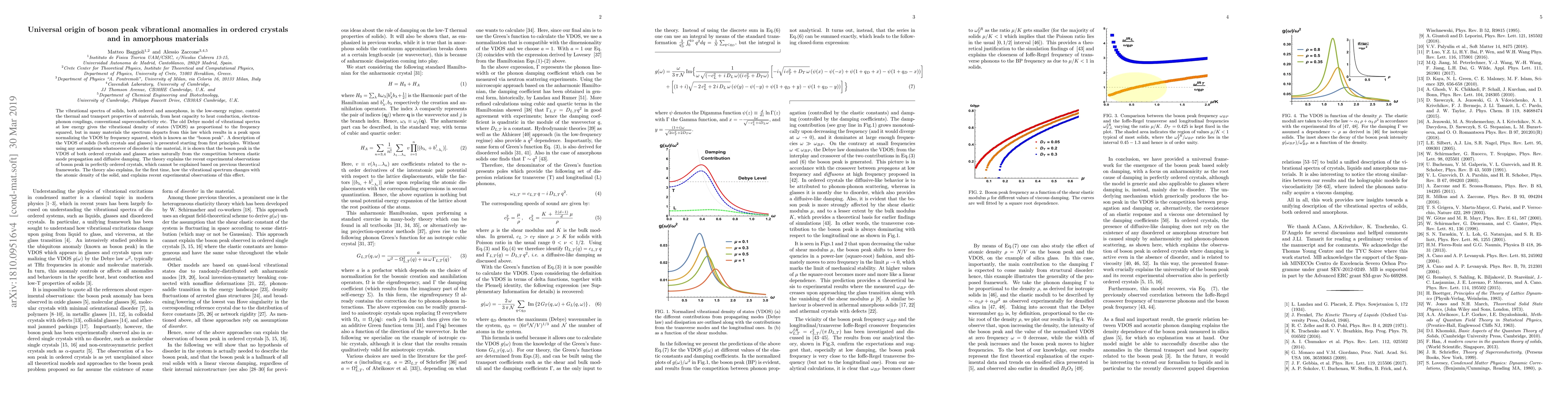 This paper presents a first-principles theory explaining the universal origin of the "boson peak" in both ordered crystals and amorphous materials, arising from the interplay between elastic mode propagation and viscous damping. The theory accounts for recent experimental observations, including boson peaks in perfectly ordered crystals and variations in the vibrational spectrum with atomic density.