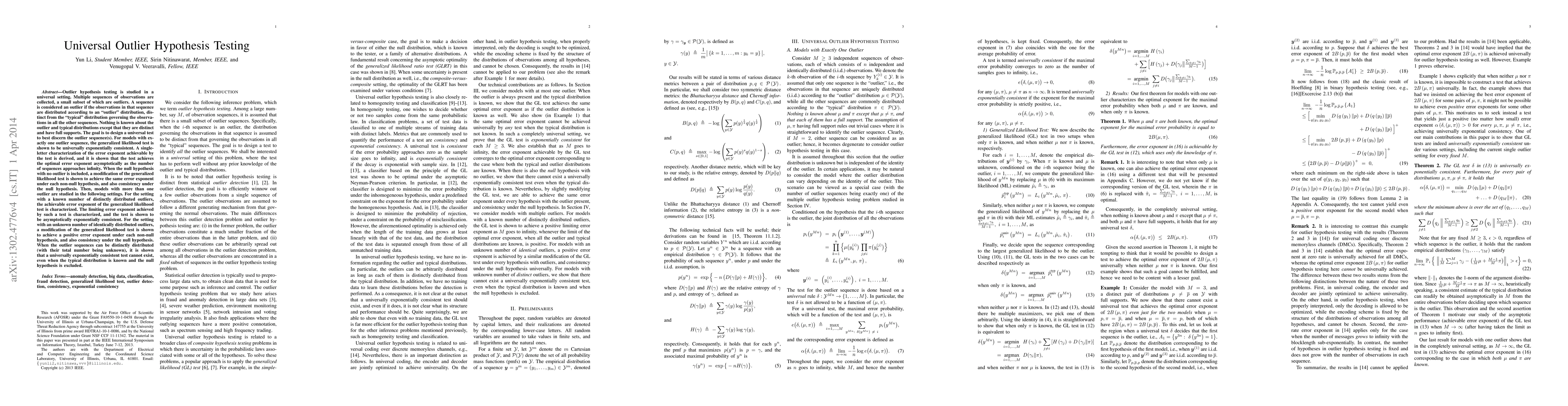 This paper studies universal outlier hypothesis testing across multiple observation sequences, where some sequences contain outliers governed by a distinct distribution. It proposes a generalized likelihood test that is universally exponentially consistent, achieving the best error exponent, while proving the impossibility of any other universally consistent test under certain conditions.