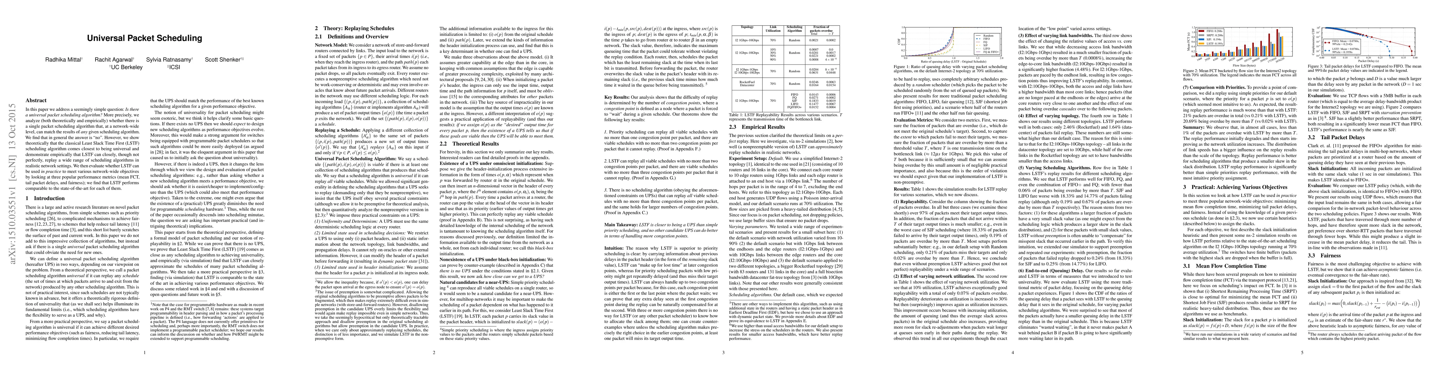 The paper presents a detailed analysis of packet scheduling universality, identifying LSTF as the algorithm that most closely approximates universality and demonstrating its effectiveness through empirical evaluation.