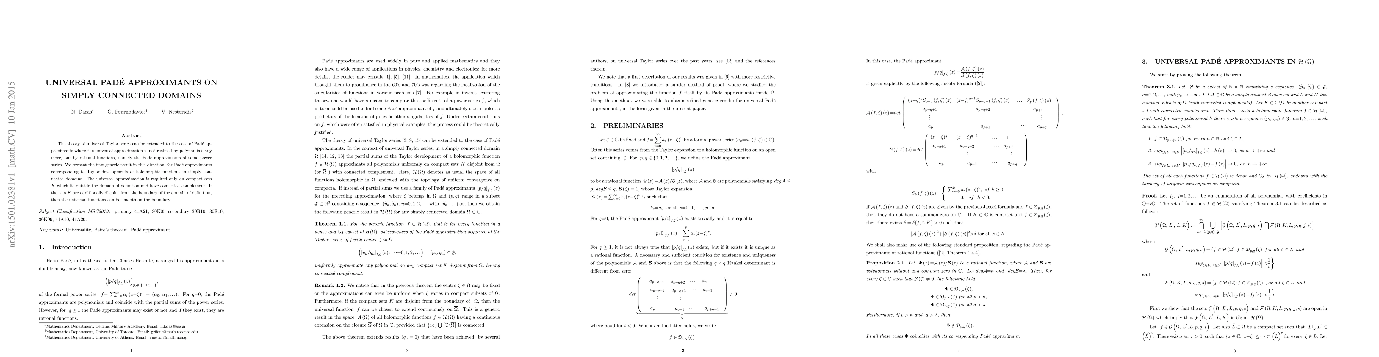 This paper extends universal Taylor series theory to Pad\'e approximants, showing that rational functions, specifically Pad\'e approximants, can universally approximate holomorphic functions in simply connected domains. The universal approximation holds on compact sets outside the domain with connected complements, and can be smooth on the boundary if these sets are disjoint from the domain's boundary.