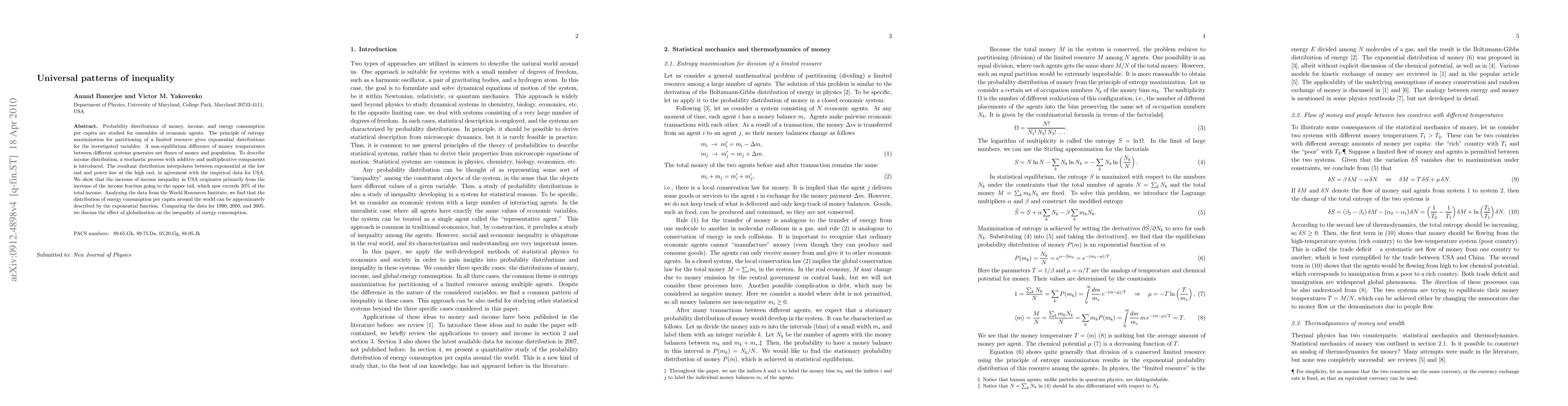 Probability distributions of money, income, and energy consumption per capita are studied for ensembles of economic agents. The principle of entropy maximization for partitioning of a limited resource gives exponential distributions for the investigated variables. A non-equilibrium difference of money temperatures between different systems generates net fluxes of money and population. To describe income distribution, a stochastic process with additive and multiplicative components is introduced. The resultant distribution interpolates between exponential at the low end and power law at the high end, in agreement with the empirical data for USA. We show that the increase of income inequality in USA originates primarily from the increase of the income fraction going to the upper tail, which now exceeds 20% of the total income. Analyzing the data from the World Resources Institute, we find that the distribution of energy consumption per capita around the world can be approximately described by the exponential function. Comparing the data for 1990, 2000, and 2005, we discuss the effect of globalization on the inequality of energy consumption.